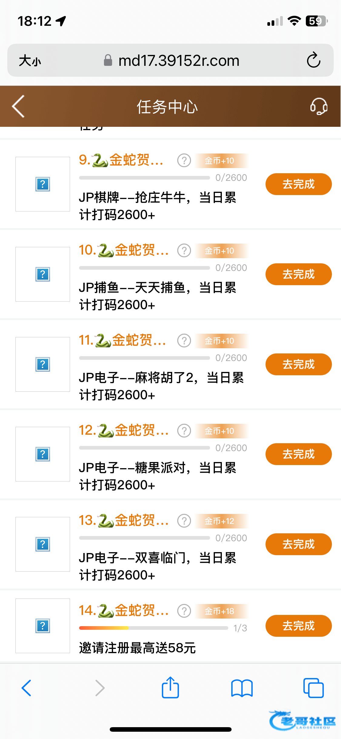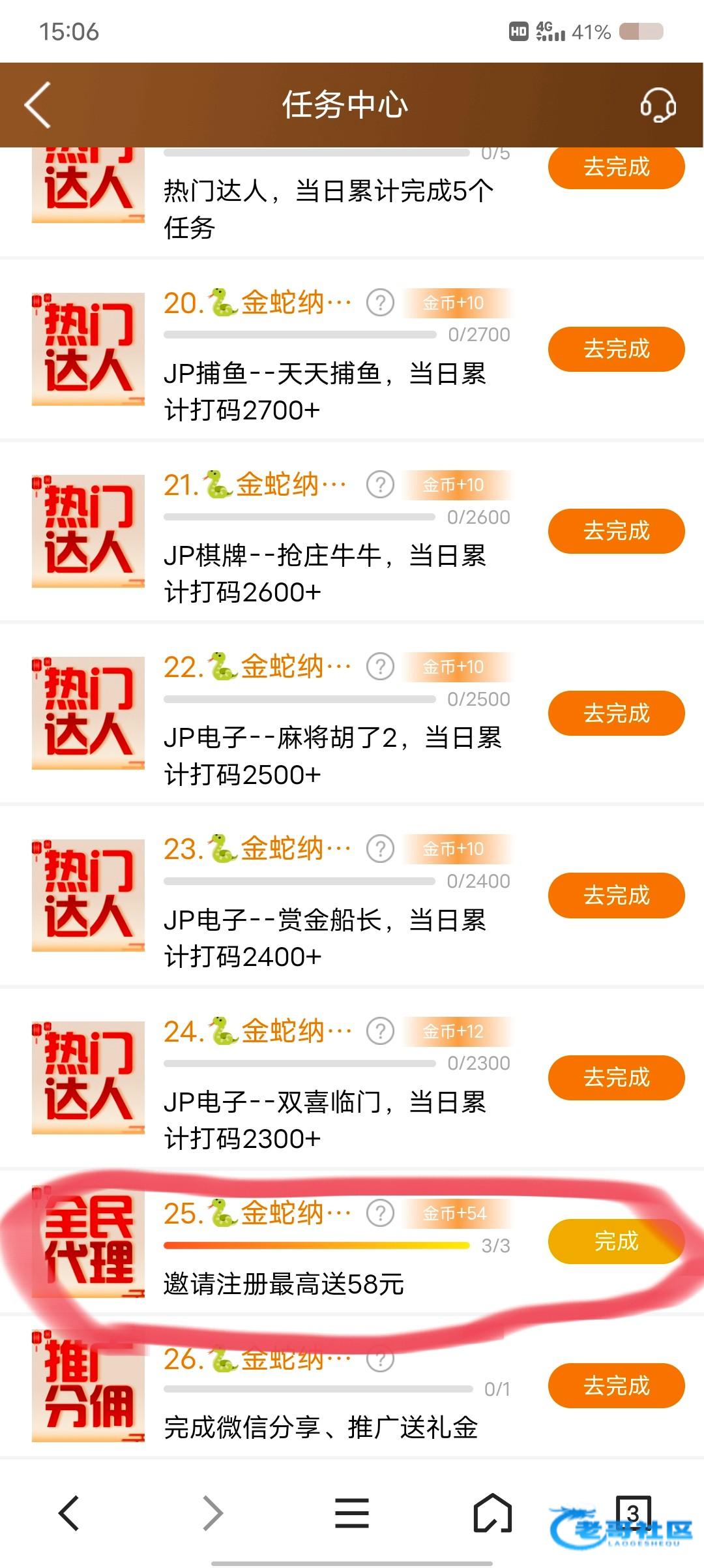 找到任务中心 综合任务倒数第二个<邀请注册最高送58彩金> 分享给朋友或者自己注册一个小号 我领取了3个 一个18彩金 上级有18-28 下级有28-88 注册新账号必须绑定邀请人的推广码 自己看看吧 我领取了54 下级三个一共领取了三个28 不需要充值可以直接领取35273.com