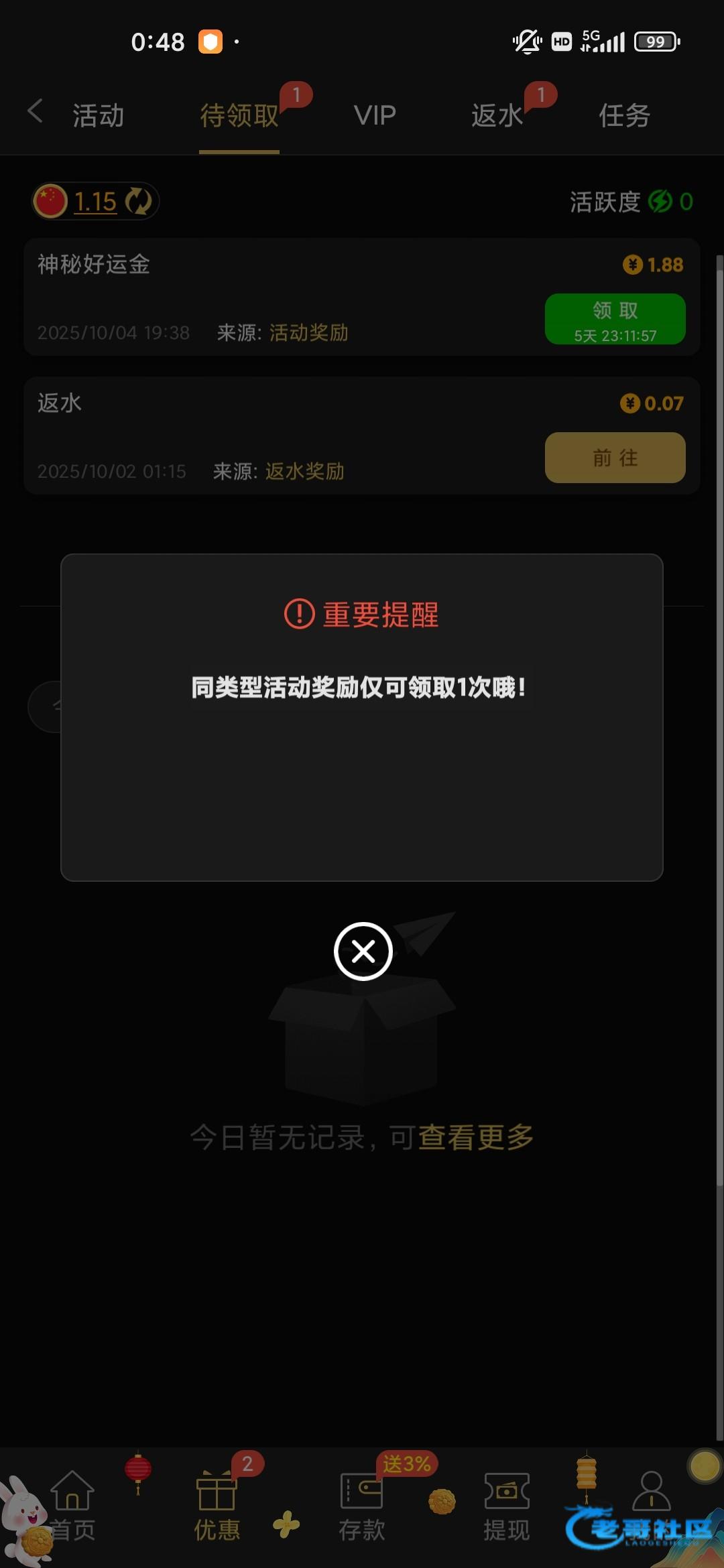 垃圾平台,前几天50空转,来看看回馈就1.88,点领取显示不能领,还有这么垃圾的?