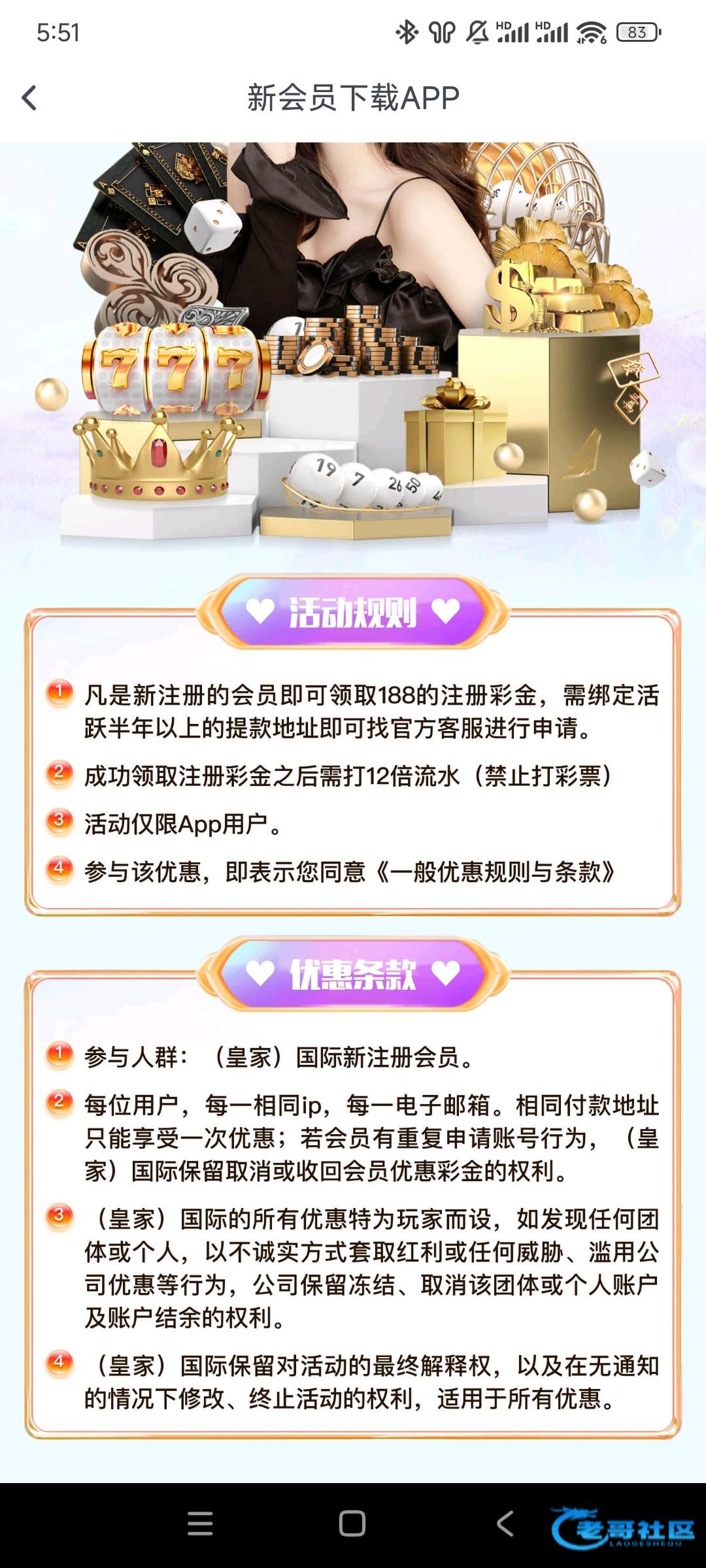 http://hjgj.cx 下载app,绑定手机号支付宝,活跃u地址,找客服申请注册彩金188,客服回复慢的很,发app下载截图给客服,我等了一个小时,禁止彩金跟28,12倍流水,禁止充值,禁止充值,我没打出