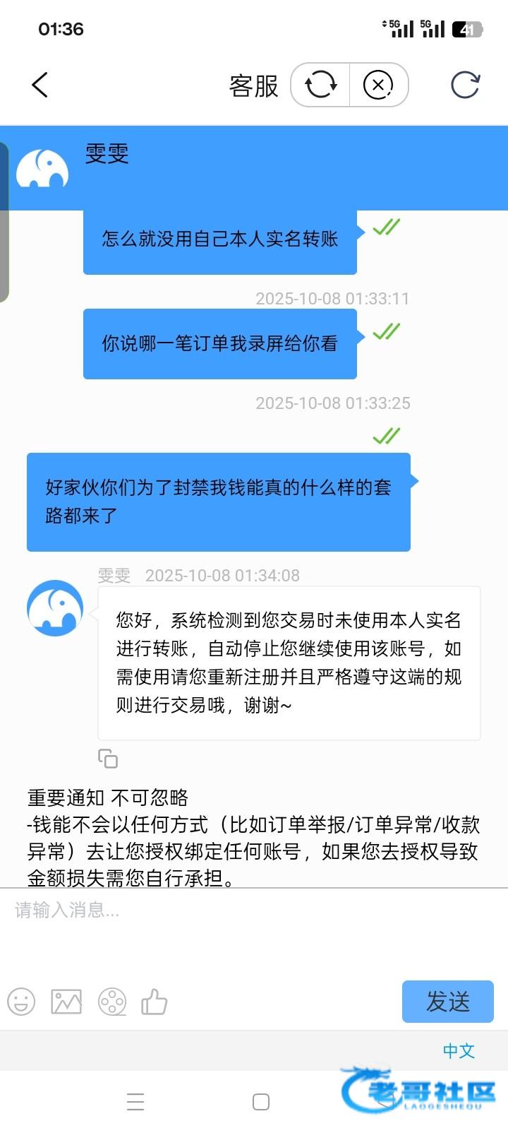 今天凌晨发现钱包封禁了去找客服,说我骗单,我压根就没p图,过然后换了一个客服另一个说法说我收到款没给人打币我录屏发过去后又说我买币不是自己实名转账。反正就是各种理由封禁钱包不给解禁。还好我钱包没钱没损失