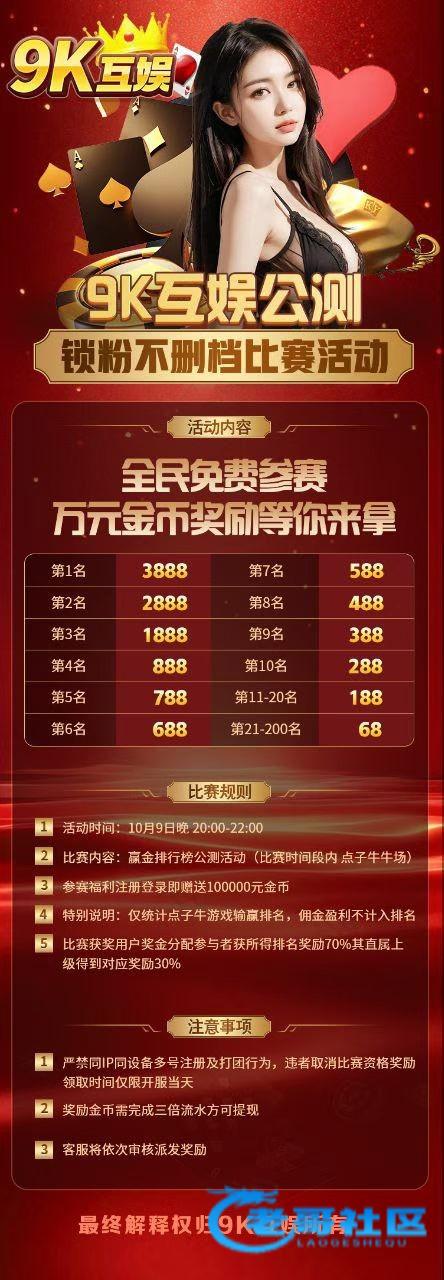 今晚比赛取消-公测比赛调整为在正式服举办。- 比赛时间:11号(明晚)20:00—22:00- 比赛玩法:癞子牛牛- 排行榜奖励金额不变。- 正式服开启时间不变。