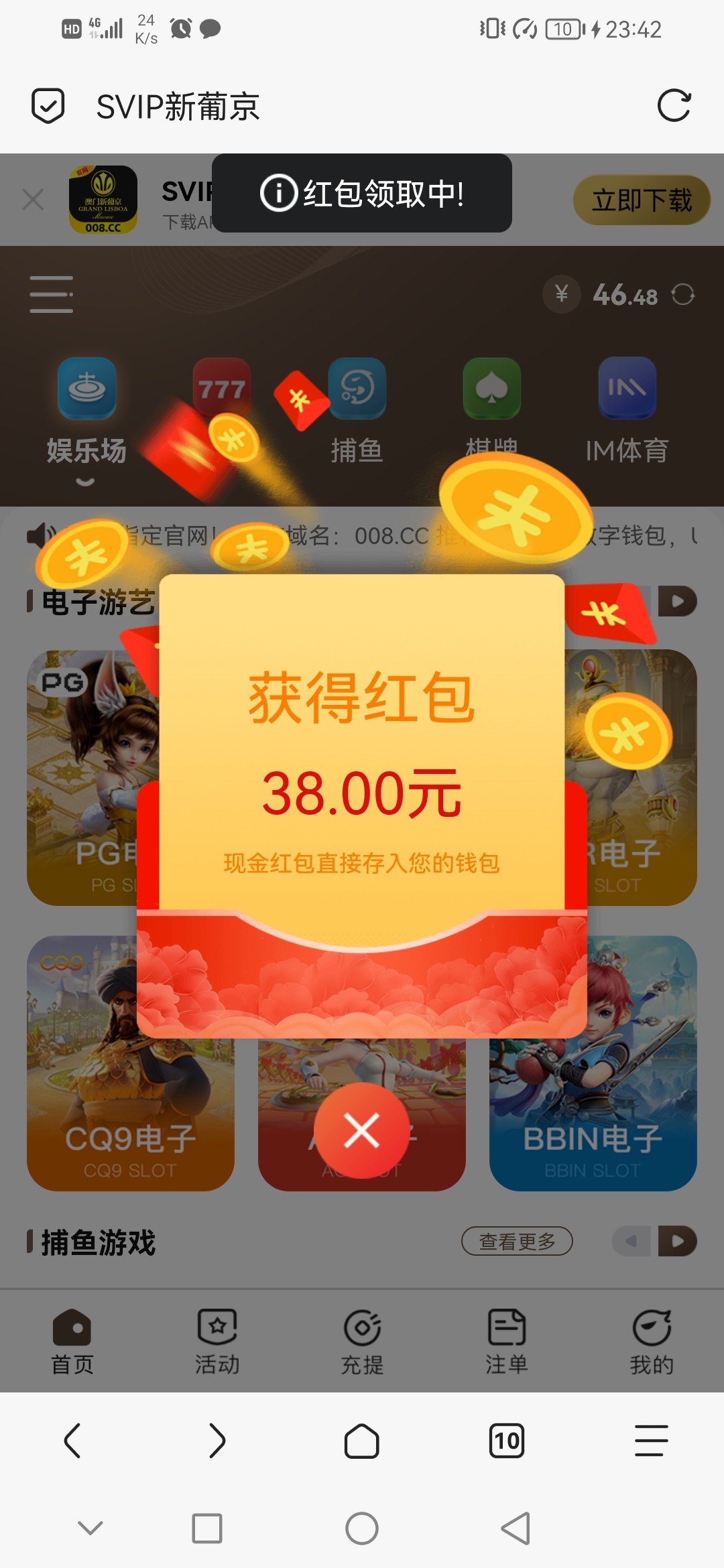 2022年充了100,上去有8领38,这模板真小气,38还要博380才能出,没这运气
