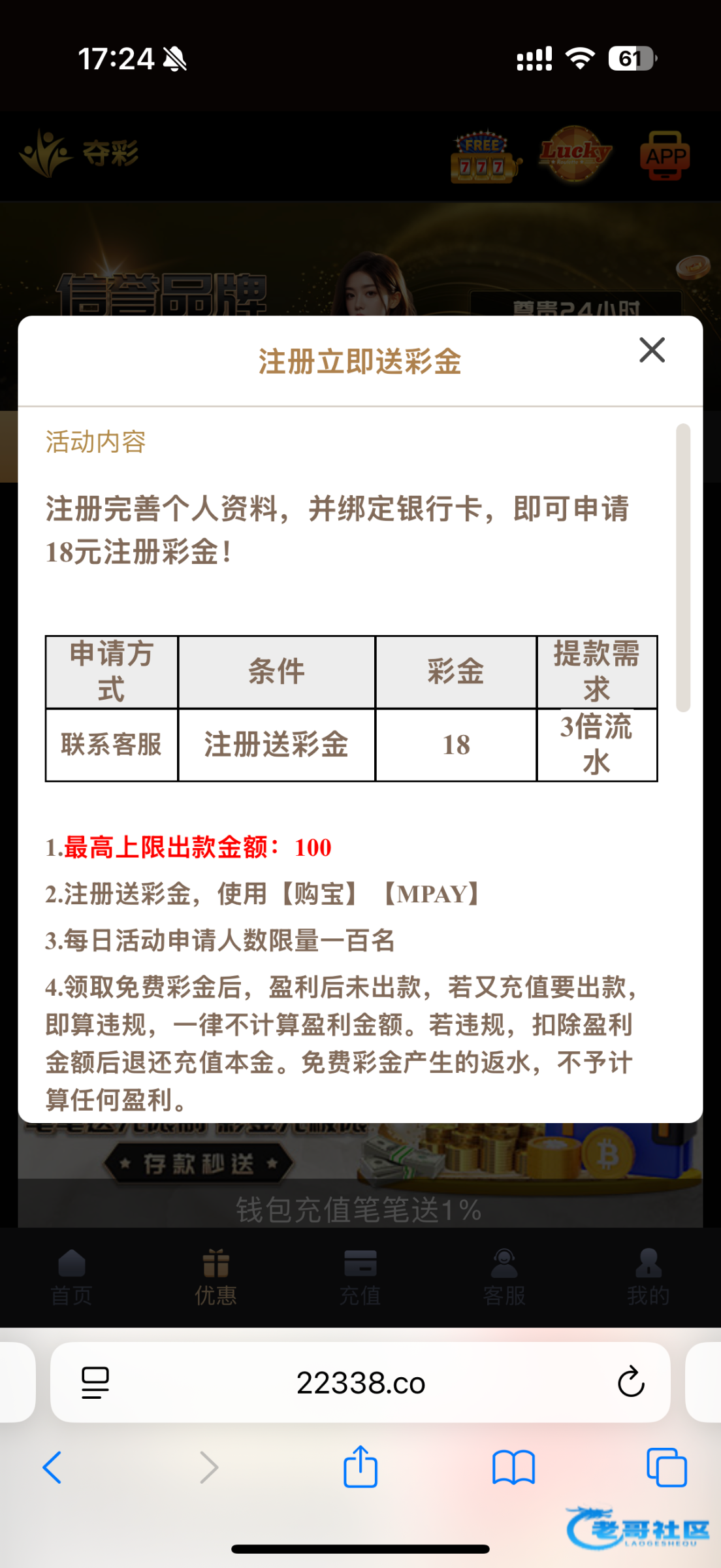 22338.co 自己带点脑子别说在论坛看到的 之前发过,但是现在又可以了,还没有撸过的试试吧