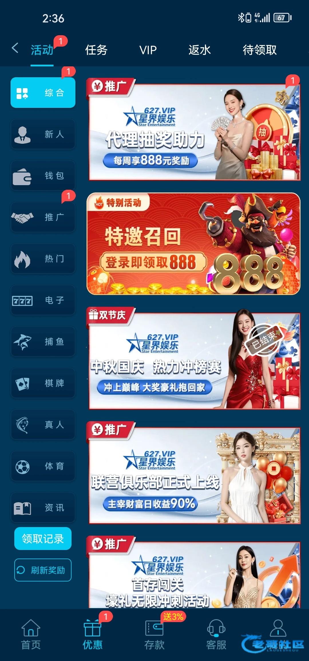 星界刚出的召回活动,我最近在天天充值玩所以不符合,有老哥之前注册过的可以去试试看,627.vip 如果打不开老哥稳台里也有链接