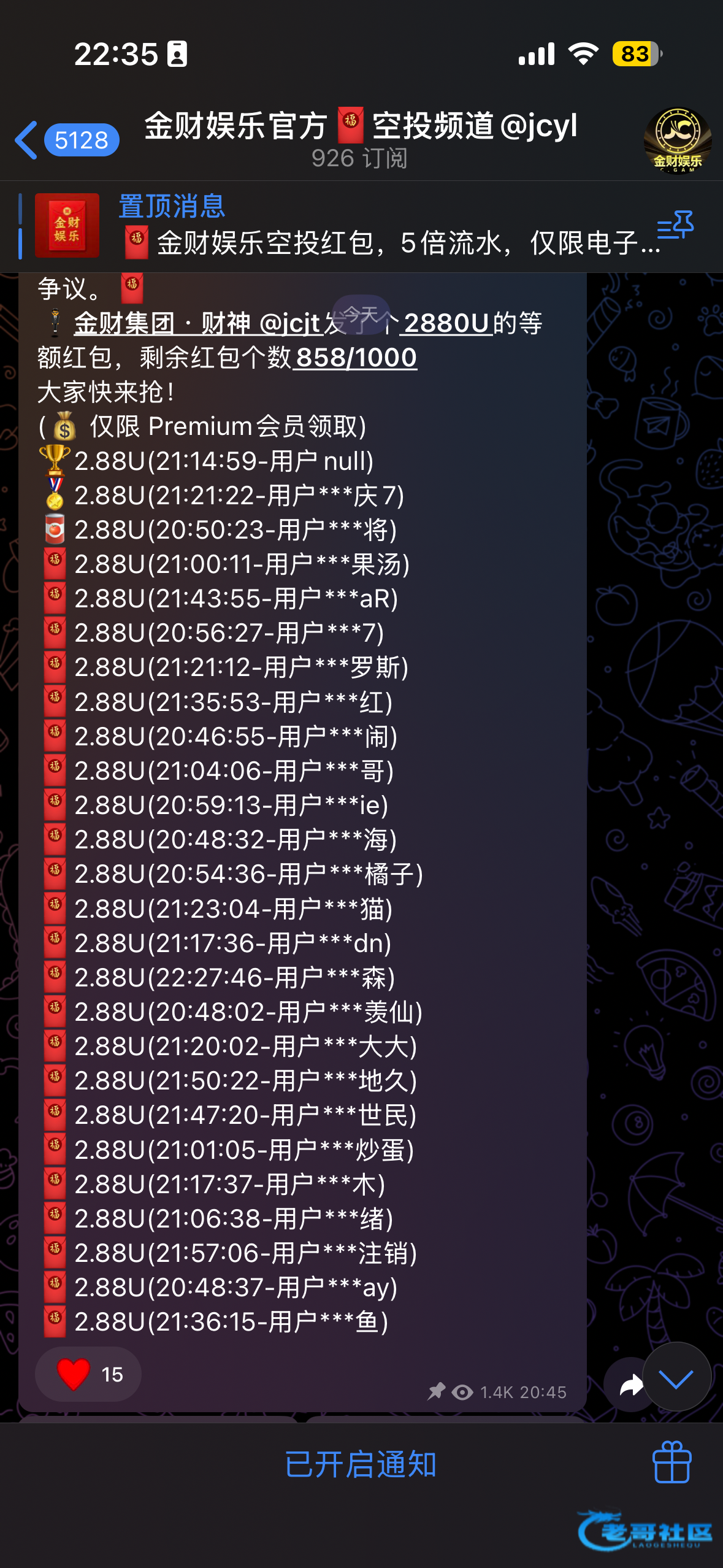 没充值过的也可以抢,红包频道 https://t.me/jcyl0000