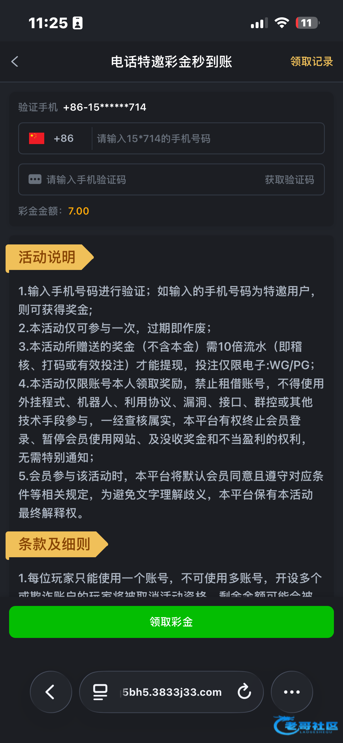 3833.com之前领取过的可以再领取一次 显示要活动开始后才能领取的话 到安全中心 手机号那里点一下换绑手机号 然后重新注册账号就能领取特邀彩金7块钱