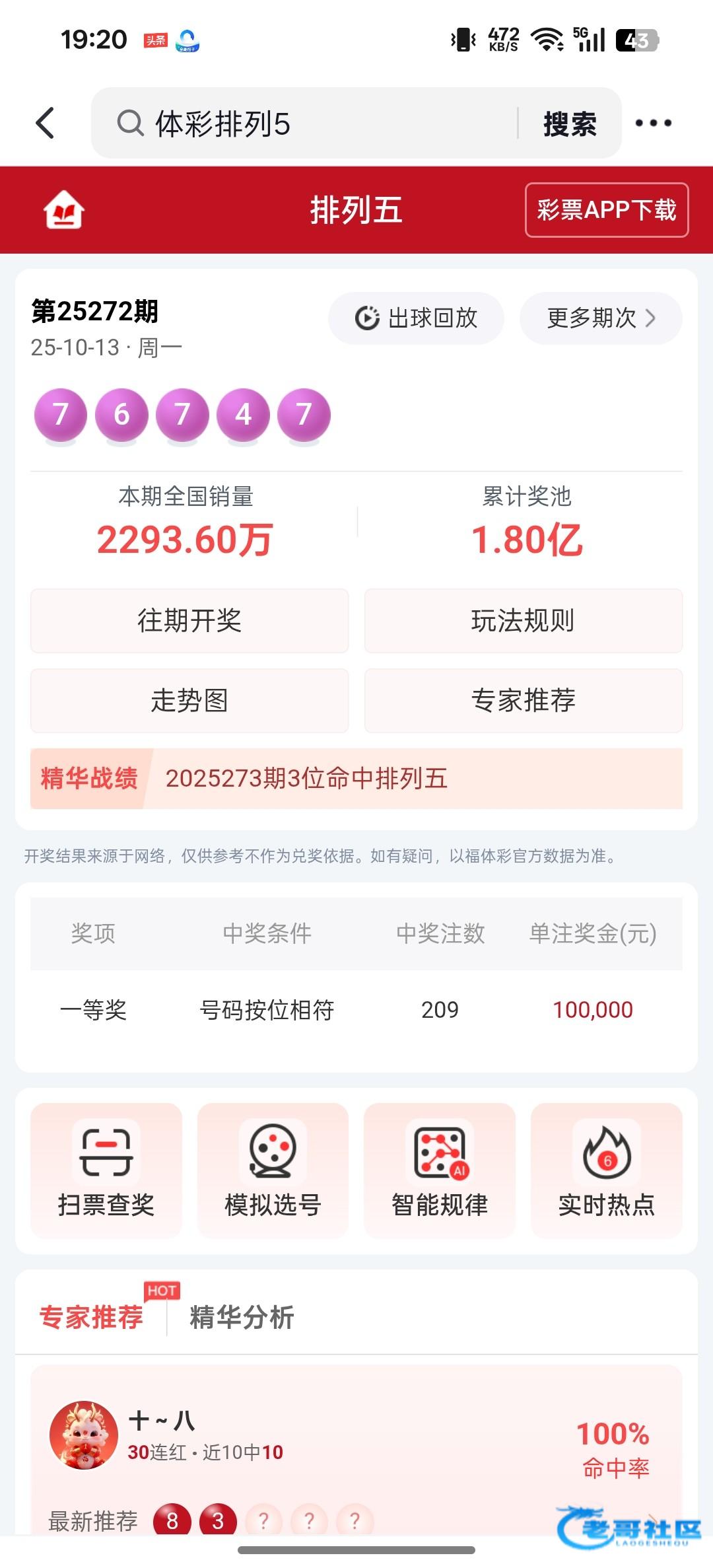【终于大红了6块排列五中10万】