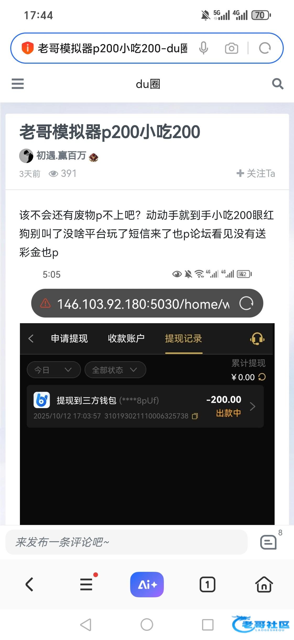 自从上个月挂壁之后半个月了送的彩金十个九个输 还有一个赢了也不提 七个月没上班全靠白嫖活着 大红了酒店小赢了挂逼房 没钱了楼梯口我太累了 白嫖了在手里花都没花又送别的平台 完事再找白嫖赢了花好心累啊 路在何方啊 人倒霉的时候干啥都不顺啊 半个月被四个平台黑了充值500提1700账号冻结充值300提680审核无限期 还有俩个打出来了要充值没钱充值梭哈没了 我真心累啊 现在身无分文在楼道口坐着 今天送了388彩金最多到430玩的电子剩400去百家乐连着挂 我真废物啊388都打出来我真废物啊 今年我也干不了活了明年再看吧 感觉论坛就我不中用 天天不是赌就是打飞机 进厂也没心进了 求老哥指条路吧 再不行一人打个猪脚饭过来谢谢