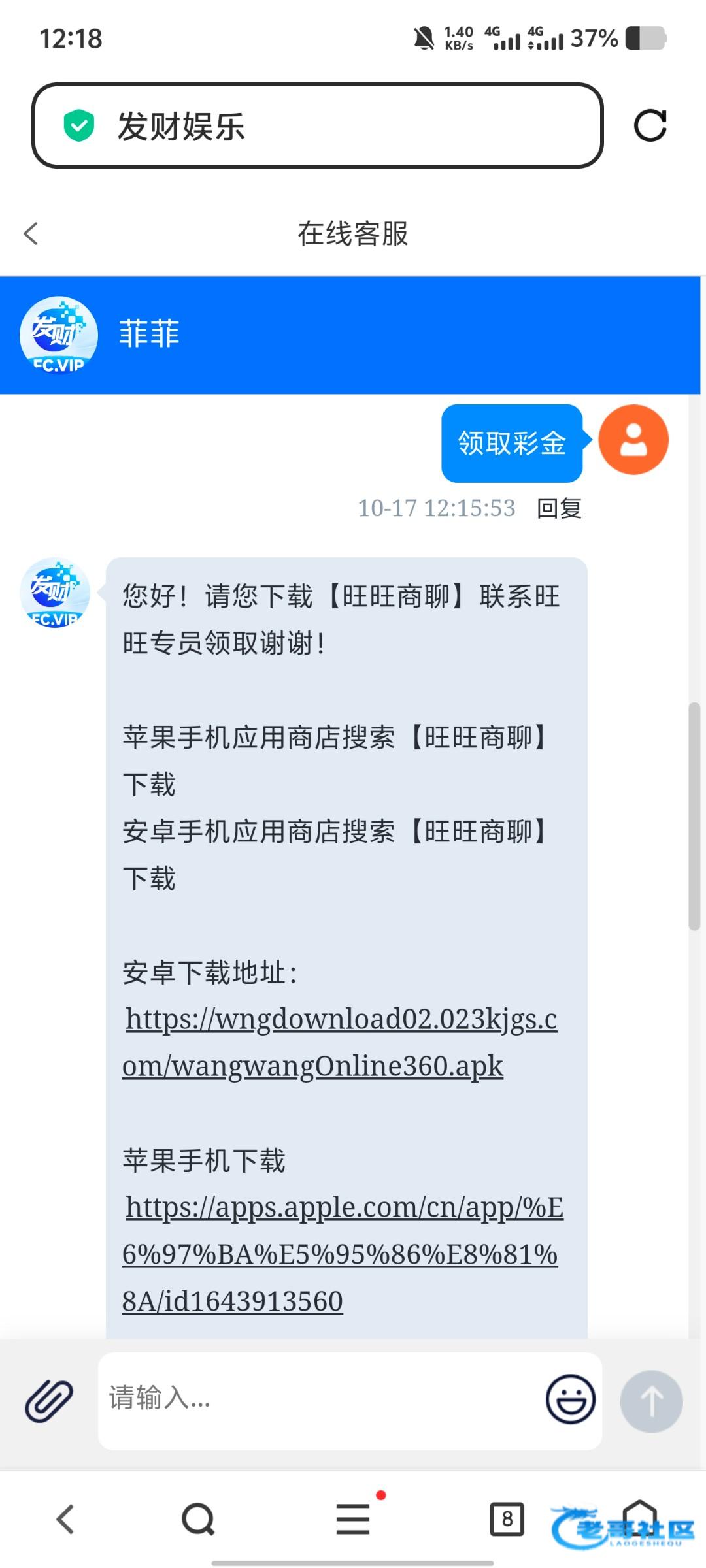 刚才打电话过来我还在打游戏是一个好像是东北的女的打过来的 我听声音就好像之前搞诈骗的那声音难听的要死没有地域歧视哈 我看见他们一家跟那个189银河一样的我就试着去问客服然后客服发了一段让我下载旺旺领取我直接骂电话里的操你妈了 她没让我说完后面的话直接挂了估计被骂出经验了 这几个狗杂种平台澳彩 189银河 现在又出了一个叫什么发财的