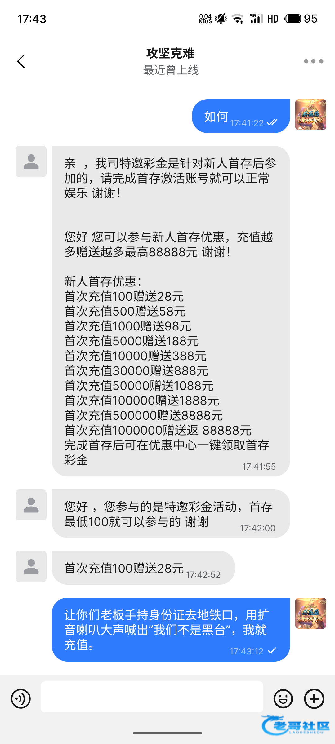 老哥们不要充为好,送58 要充100才能游戏,有28优惠!充值后余额188!送的58十倍流水:58*10+100+28. 电子一点水没有。下了360!