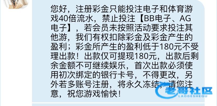 您好,注册彩金只能投注电子和体育游戏40倍流水,禁止投注【BB电子、AG电子】,若会员未按照活动要求投注其他游,我们有权扣除彩金及彩金产生的盈利;彩金所产生的盈利低于180元不受理出款!出款仅可提现180元,出款后剩余金额不可继续娱乐,首次出款必须使用初次绑定的银行卡号,不得更改,另外若多账号注册,将永久冻结,请您注意,祝您游戏愉快!,这种司马平台,你自己看看