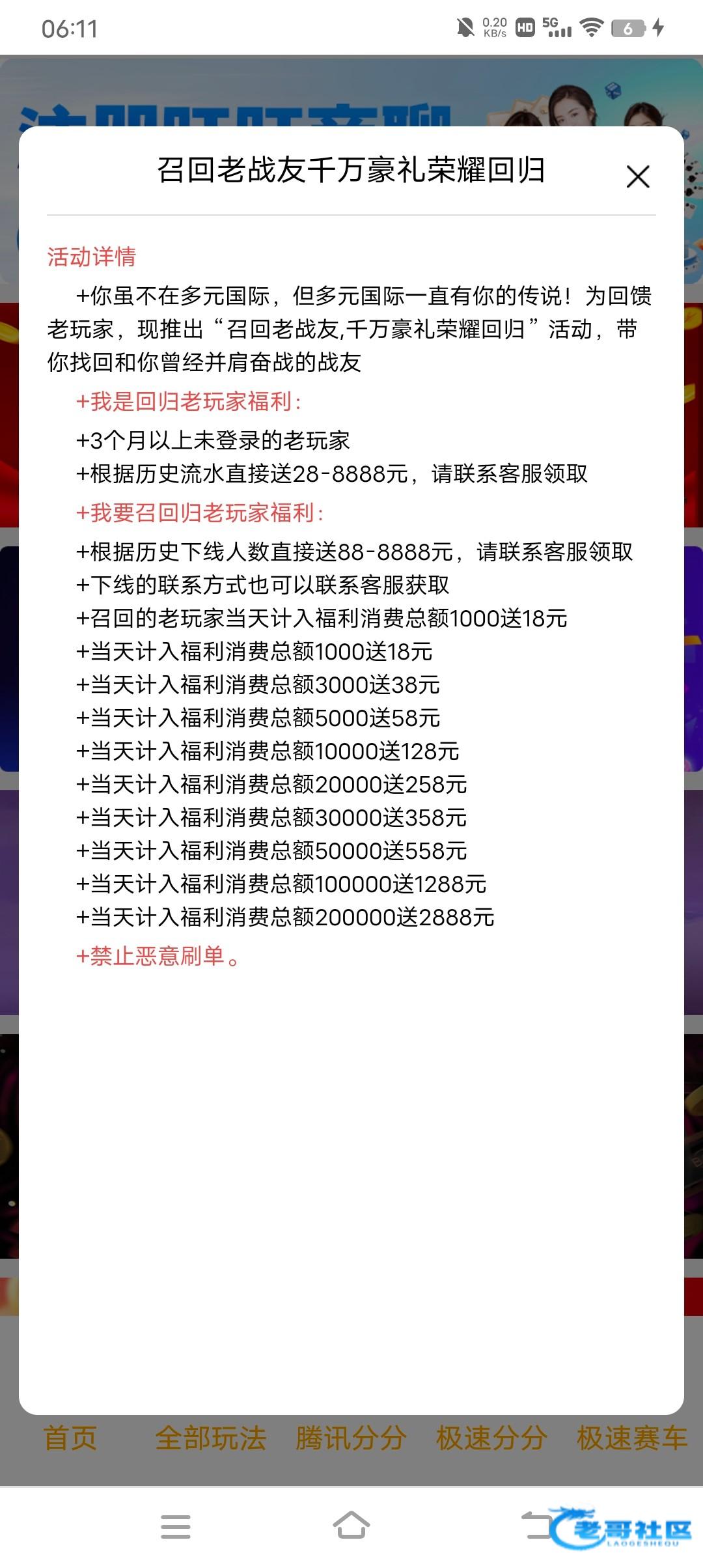 链接dy66a.com,用手机号登录,以前充值玩过的送108,1杯水提,我送了2个号,然后找客服还能申请回馈彩金,送了38挂了。有出的团个