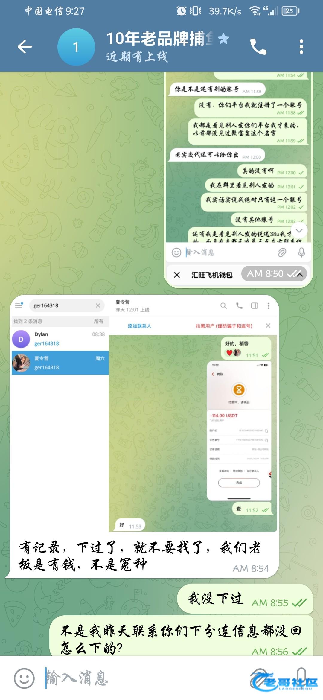 兄弟们进来看看很有意思 昨天不是有个白嫖吗,叫聚宝盆送38u,我昨天打够下分,他先是让我兑换然后发地址给他,然后我不会用汇旺,他就说让我发欧易地址也可以,我兑换之后就把欧易地址发他了,没几分钟他说我是不是多账号让我老实交代还可以给我出,我TM解释了半天他连信息都没看,今天我又去找他下分,他给了我一张另外一个人的聊天截图说昨天已经给我下分了,兄弟们你们觉得他是自导自演还是飞机会被人监控聊天记录,图中第一个人是我,第二个是截胡下分那个,所以到底是不是自导自演