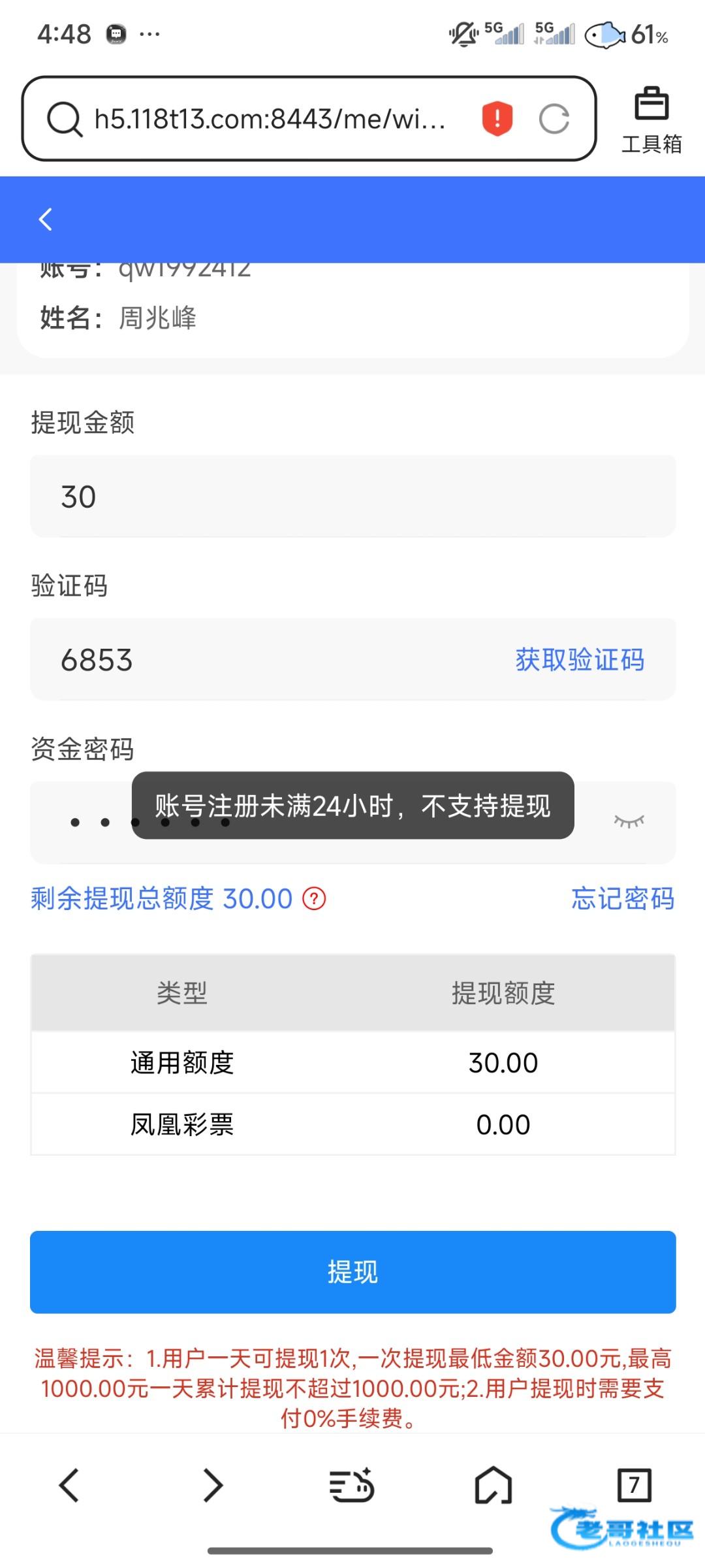 打出来了,怎么提,只有30额度,提现就显示注册未满24小时不让提
