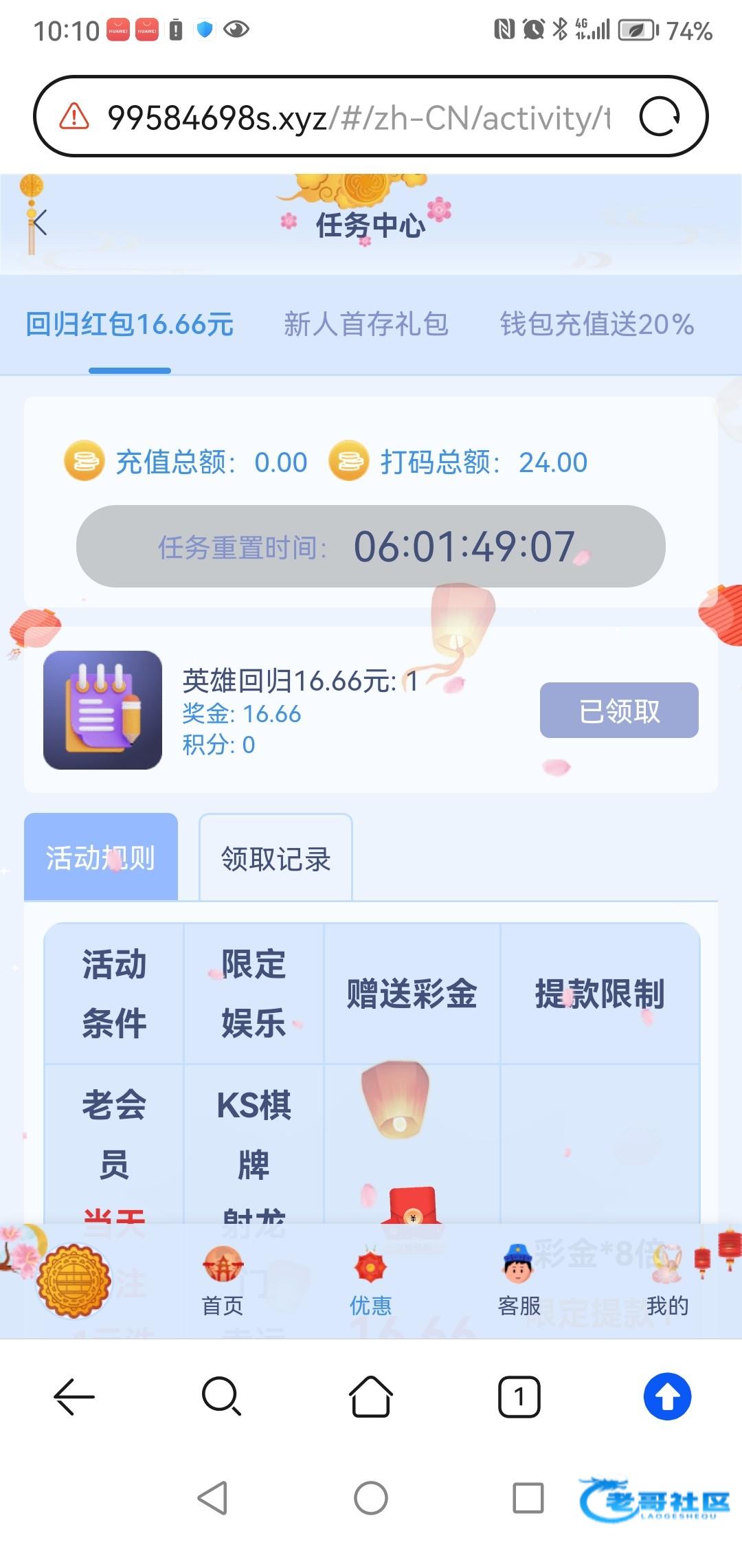 梦想回归彩金重置了,现在投注1又能领彩金了,之前玩过去去领下返水看看有没有1去投注然后领彩金 mt135.com