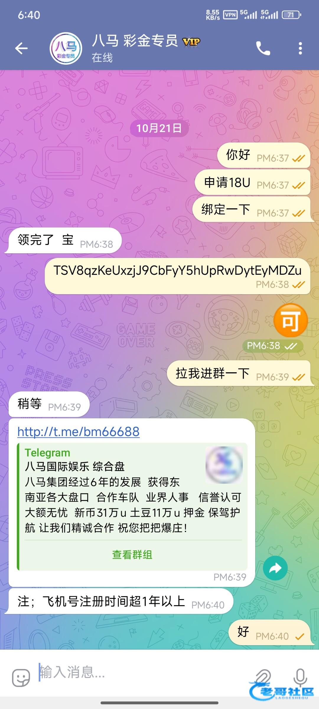 新人进群即可领18u彩金 绑定取款余额地址不得低1000u 飞机号注册时间超1年以上