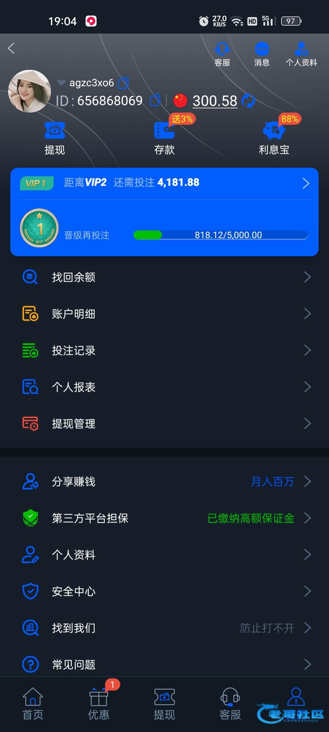 这平台一点格局都没有,上次打电话特邀还存款过30,今天看了下有18去玩捕鱼爆了300,提款取消,去问客服账号就冻结。