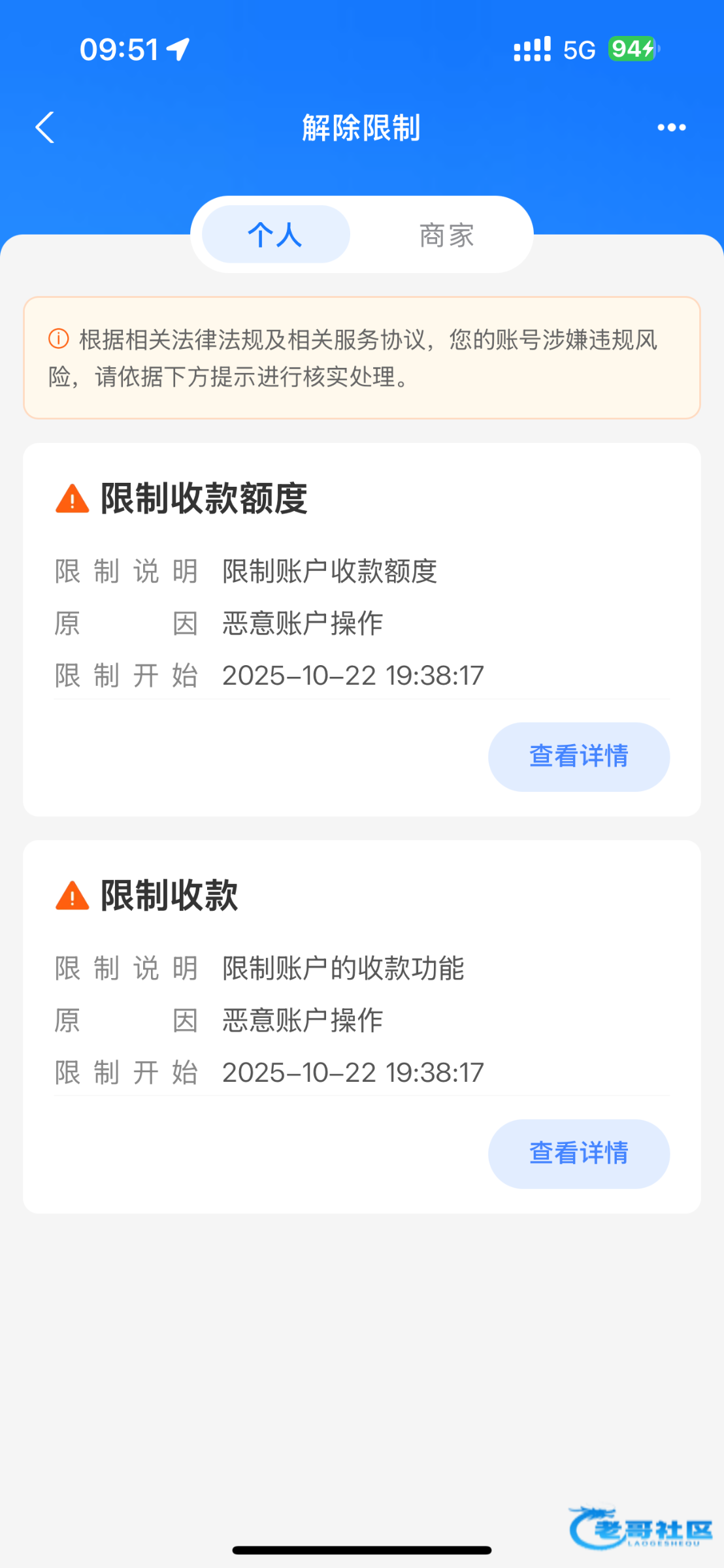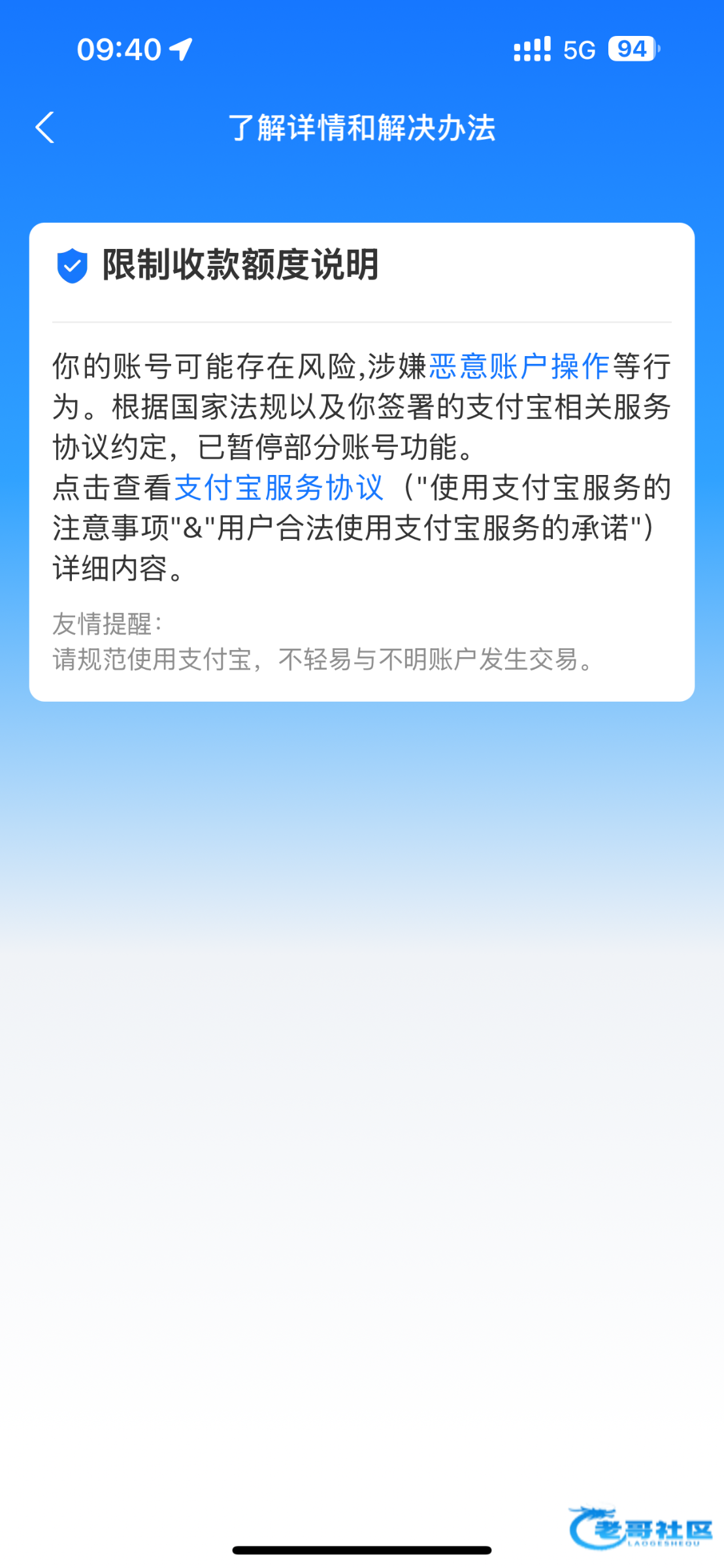 你这只是限制收款老子里面6000不能支出不能收款限制半个月就今天 微信又没钱全在支付宝 崩溃了
