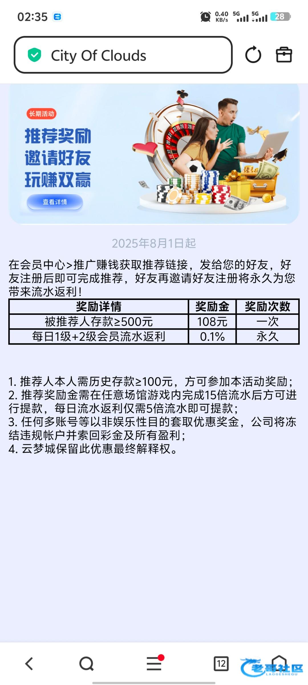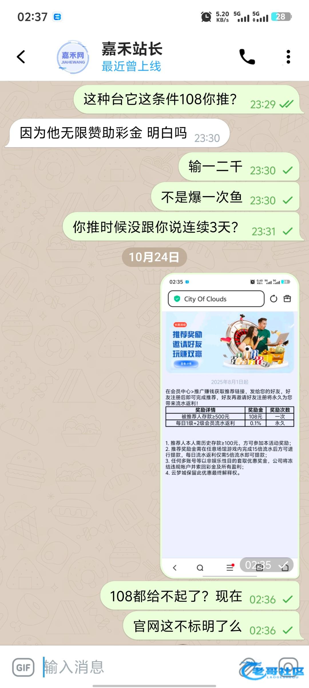 嘉某网的几个垃圾返现不是拖就是不给,大家千万不要给他们打,云梦城必反的返现也无赖不给,充值五六天流水一二万,比达标的500 5000流水三天翻几倍,推的时候写的明白的三天充值充值就行。说达标既反。不是三天连续,去要时候说要求三天连续?笑死。108这要求比保时捷还难,这不是搞笑的,保时捷多少反688好么?108是必反的台也刷无赖,在老哥打的皇冠差点达标,都立反了200 人比人气死人,嘉禾网要倒闭了是有原因的。三个垃圾做人太不行了。