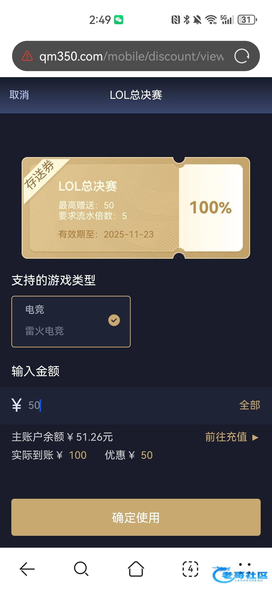网站qm6.vip可以找客服申请存50送50的电竞优惠券,然后下注100下载app去晒单有58彩金,等于50白嫖108彩金