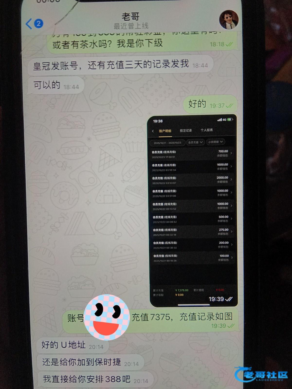 老哥真是没得说,我皇冠虽然充值了大几千,流水2万多,盈利一千左右,但是我玩棋牌电子捕鱼很少,根本没达到5000流水,也就不够申请返现资格。我看大家都在晒返现图,我就试着发给老哥问问可不可以安排茶水钱,老哥爽快地直接给我安排了388,转u的时候还多转了几U,真的是太牛逼了,以后就认准老哥下级,绝对靠谱