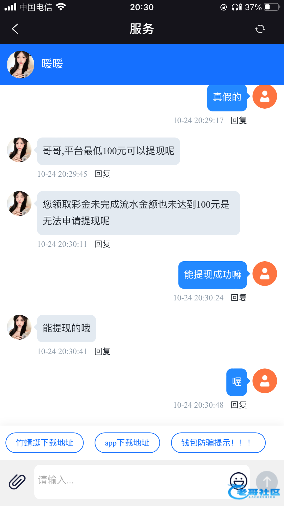 原话是这样的,兄弟们充值10元激活提现权利,然后平台tmd最低都是100,都不想说这个平台了,平台里客服有个叫昭昭,有个叫暖暖,慎重点吧