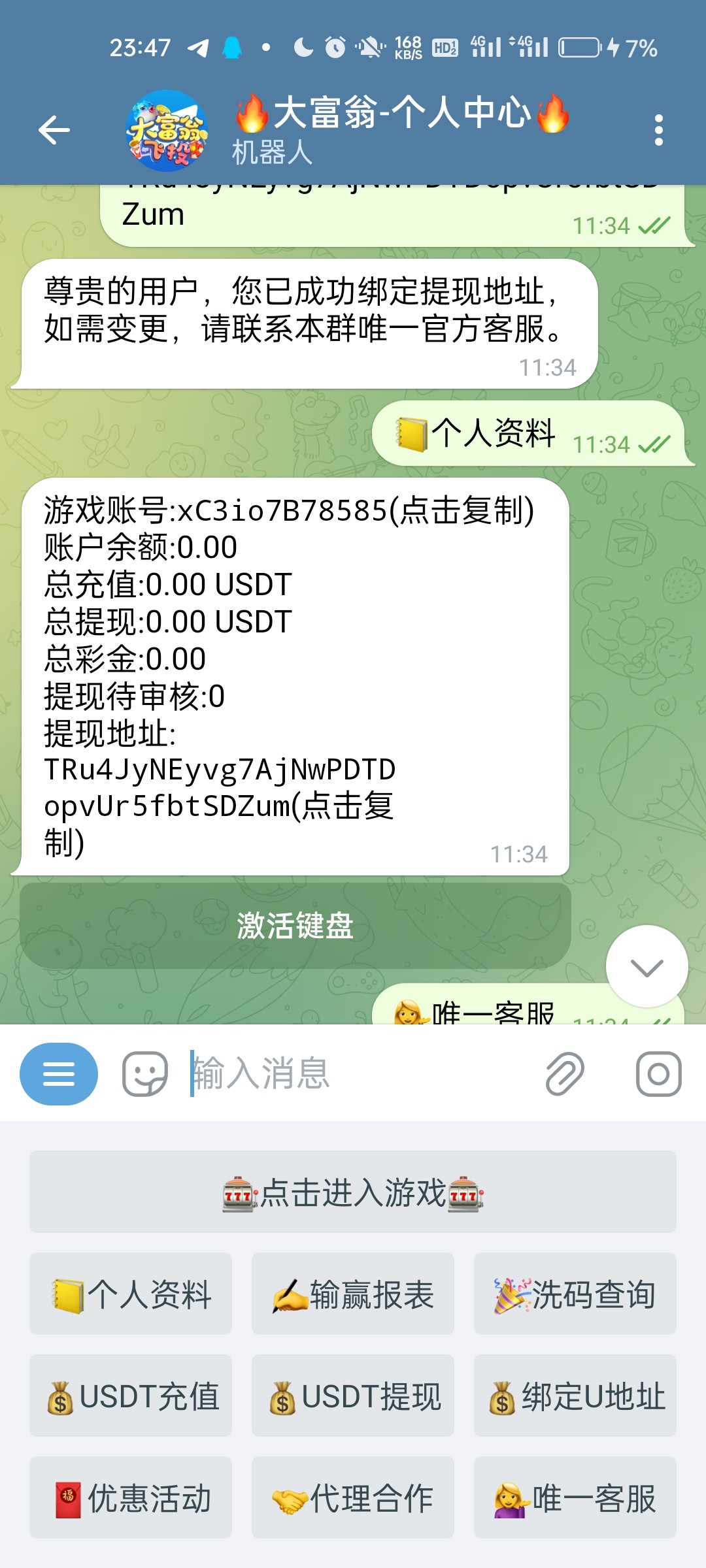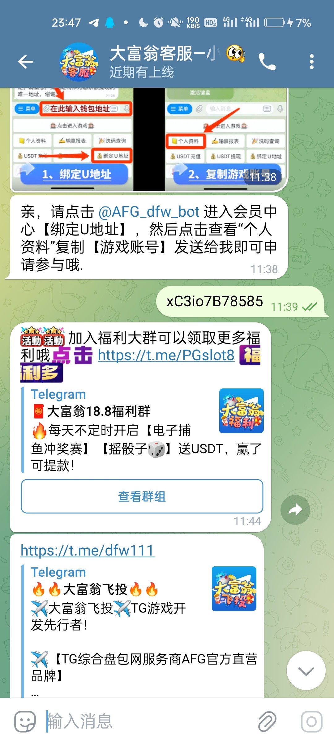 项目名称: 飞机群大富翁 送18200下10.88u,具体看下面活动图,每天可以和客服摇骰子获取彩金,具体看群活动机器人: https://t.me/AFG_dfw_bot点击机器人绑定钱包,然后点客服,跟他申请18.88,我刚试了主页不能有广告!【不建议充值 黑款自行承担】