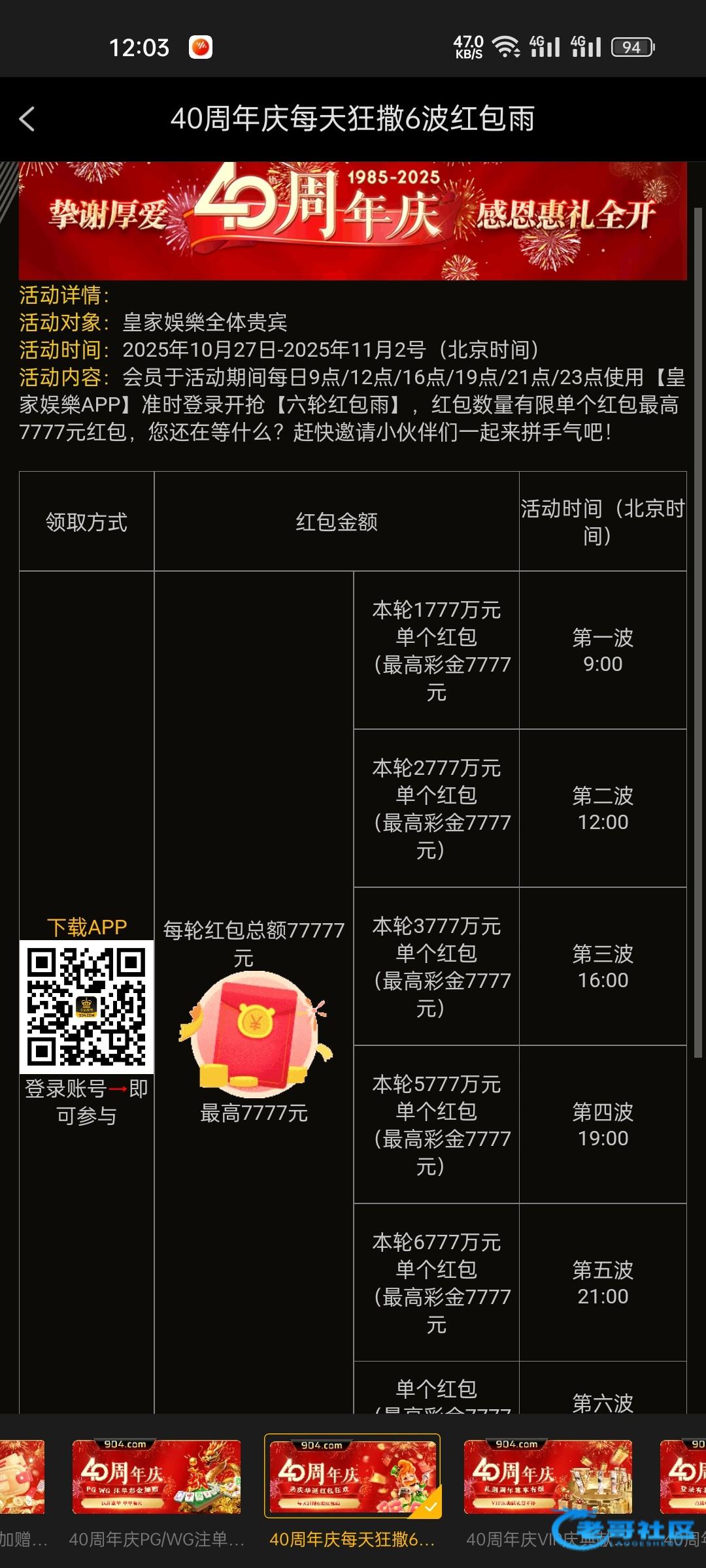 皇家娱乐周年庆抢红包,我抢了27,历史充值回馈,历史回馈我充值过但是还没收到,估计还没派发到我,有账号的老哥可以上号抢红包,充值过的也可以上号看看历史充值回馈到账了没 网址:904.com 打出来的老哥助力一下