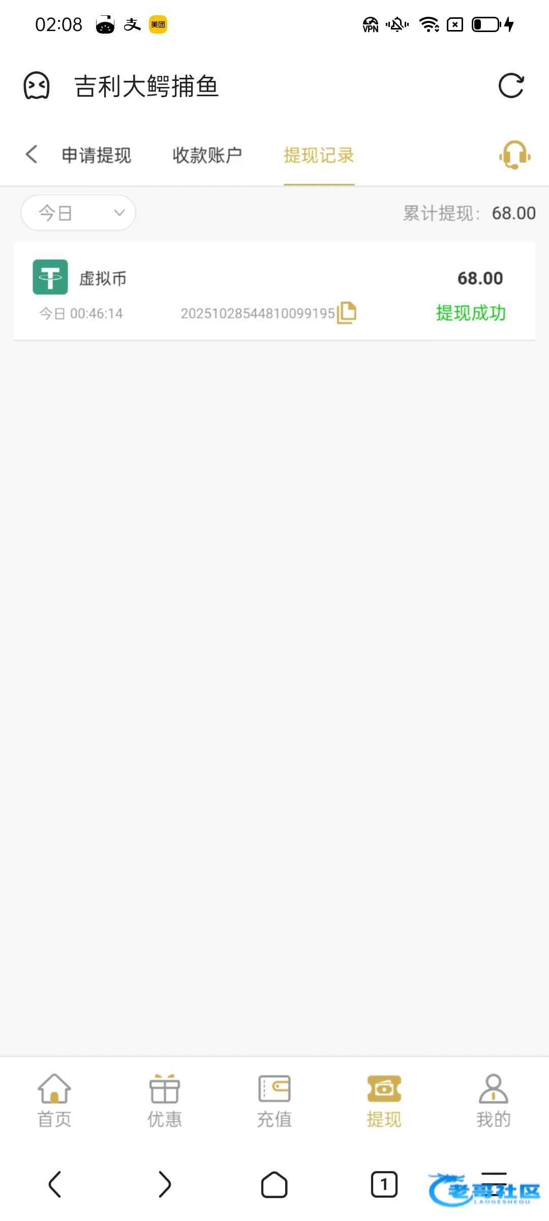 这个之前送我38u,提现要最高最低一百u,没打出来