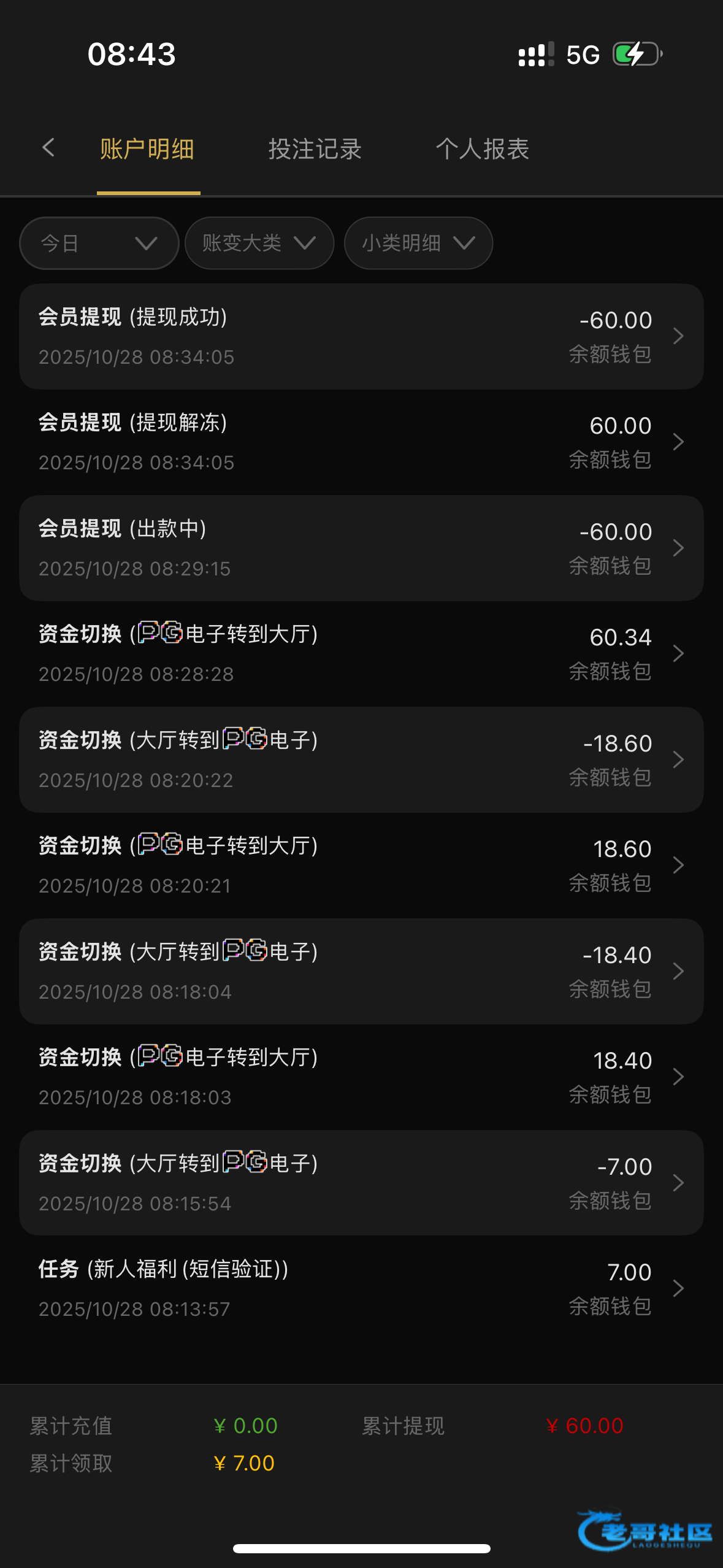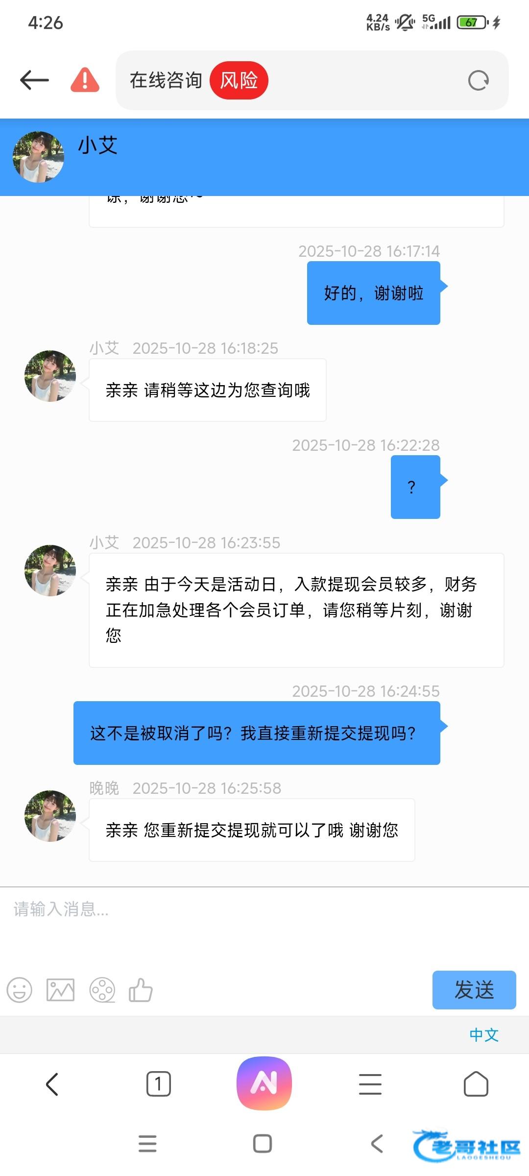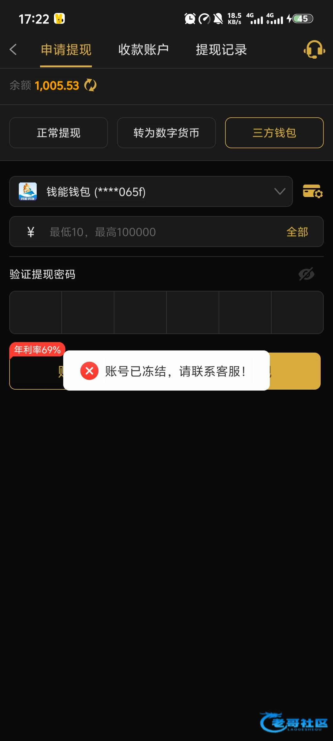 啊拉达子 ▶ x1470500 看来我也要被冻结了 提卡取消两次 刚刚第三次提28u 十几分钟没动静 3月前