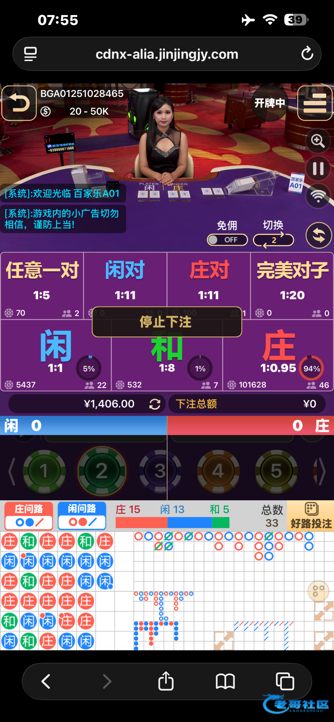 观察几天 发现BG百家乐作假 试玩居然没有延迟 而且试玩下注的金额也显示在奖池里面 扰乱真实玩家判断 这点都作假那全部都是假的 更有一点是居然控制在50局到53局左右就洗牌了 每次切牌都这么准?而且每个台桌都是55局内就发到黄牌洗牌 厉害了