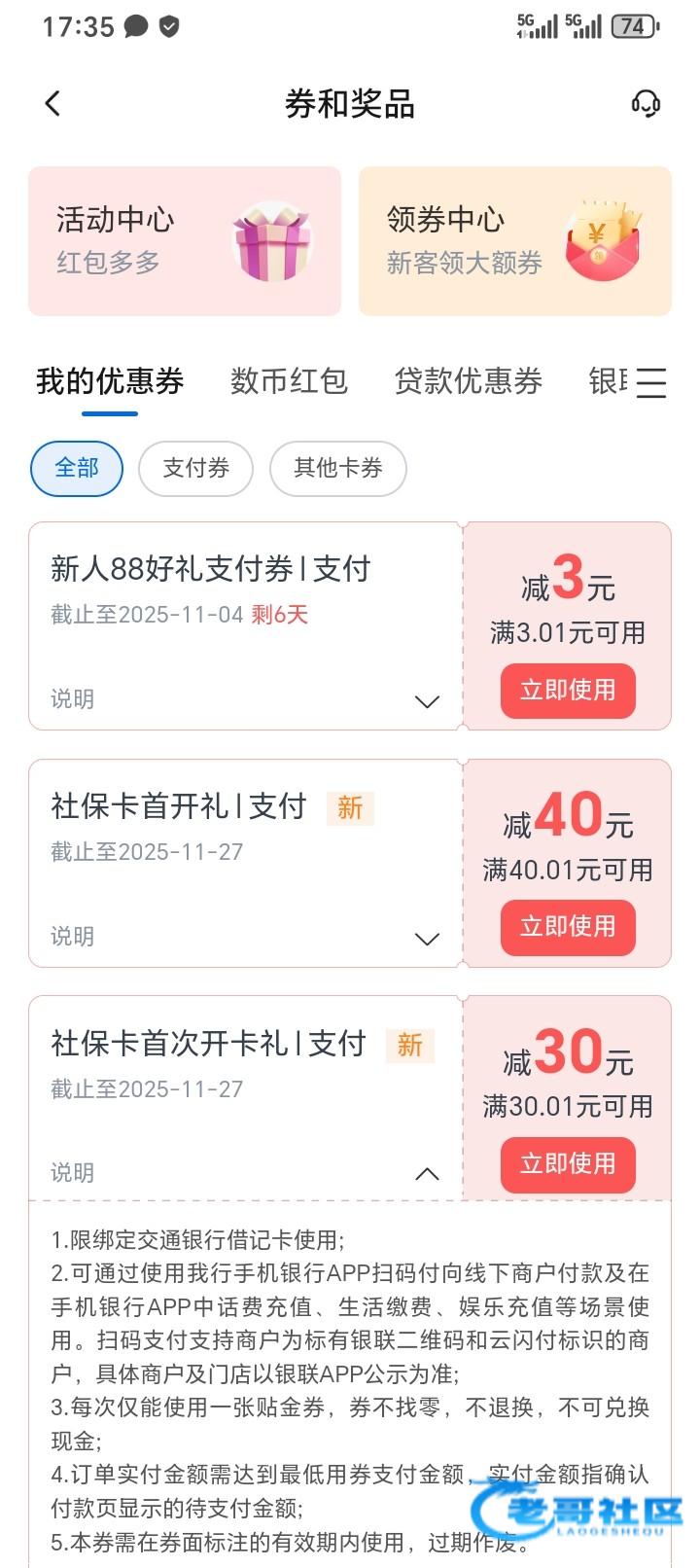 还没开过社保卡的可以去交通银行办卡,他们的银行卡也就是社保卡,所以肯定会给你办社保卡。办好卡建行app里面一共70的劵,还有6块微信立减金,30的满30.01就能用,点外卖可以用,亲测有效。