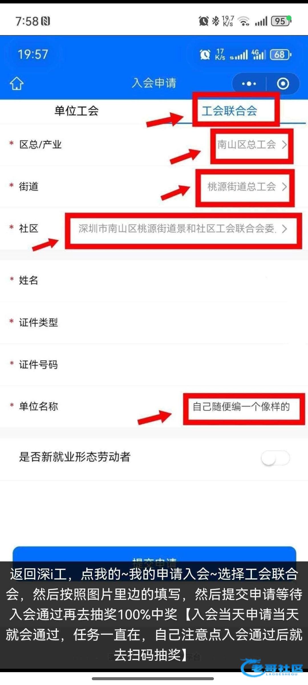返回深i工,点我的~我的申请入会~选择工会联合会,然后按照图片里边的填写,然后提交申请等待入会通过再去抽奖100%中奖【入会当天申请当天就会通过】