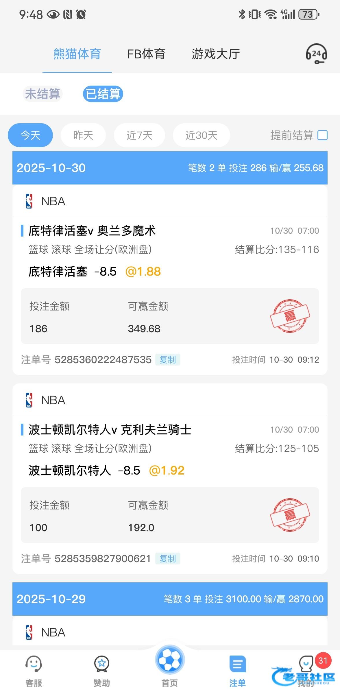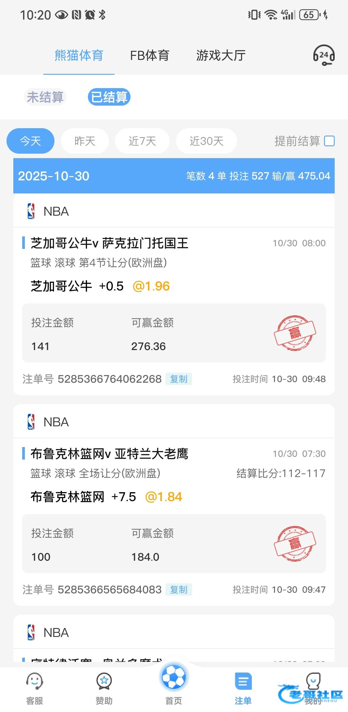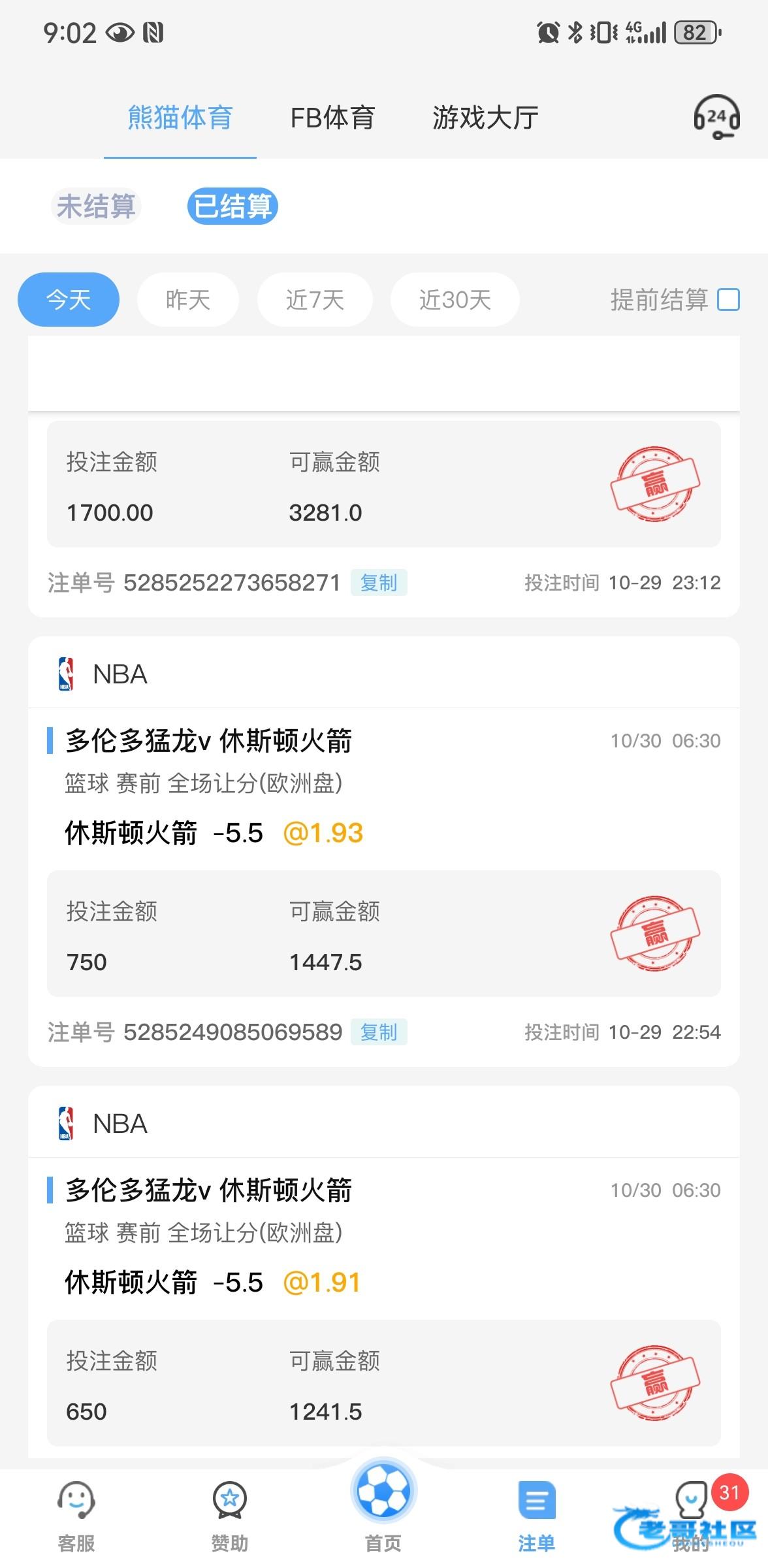 前面电子输老多了,最近转战体育,不管是玩单双还是让分,运气都转运了不少,今天又是全胜姿态,可惜没敢梭哈 没有前几天的胆识了