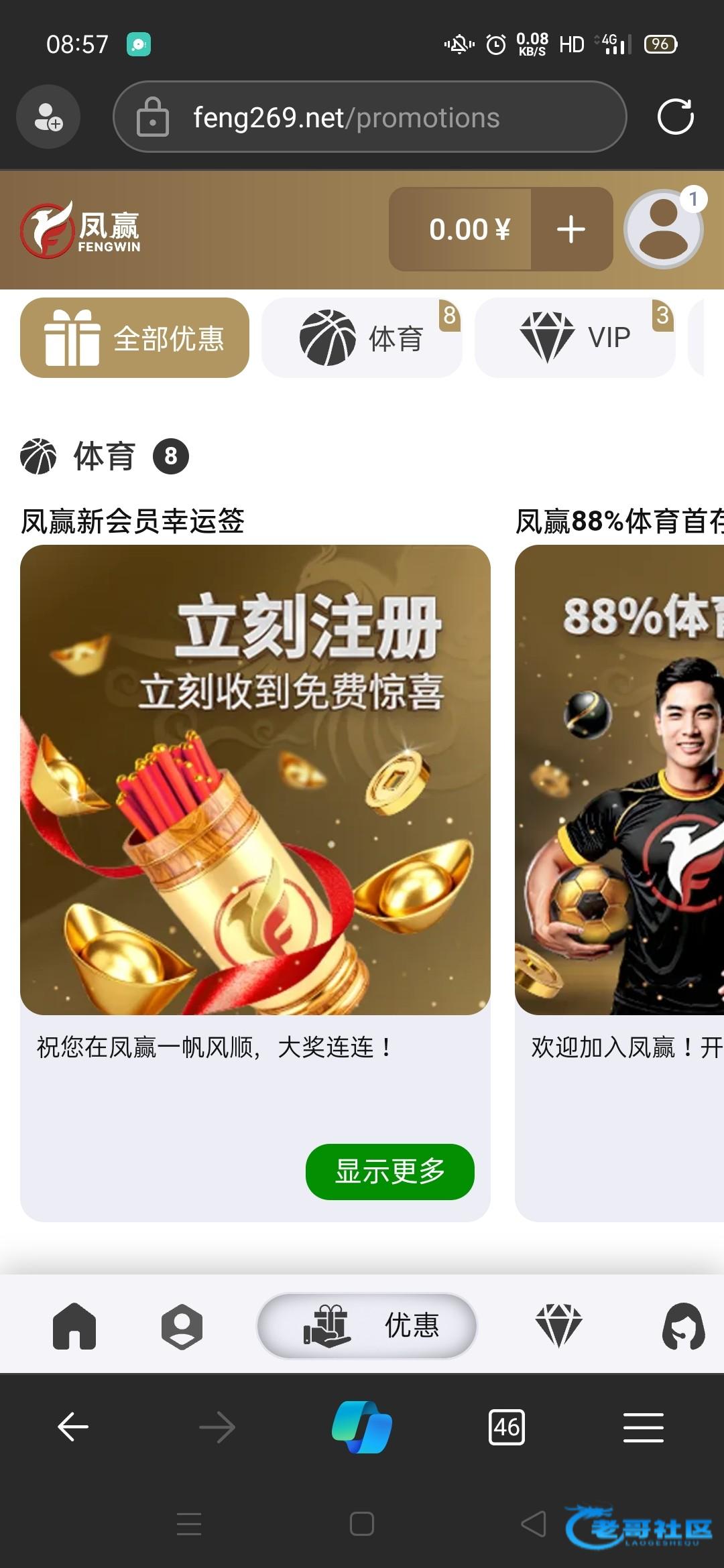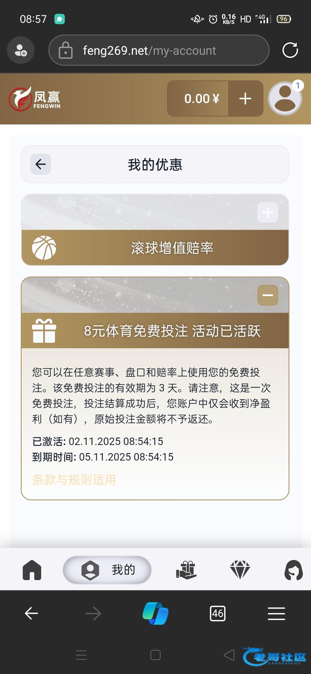 注册自动在个人中心,优惠活动抽取免费彩金。我抽到8块体育彩金。还没玩,出款自测。网址http://fengluck.com/