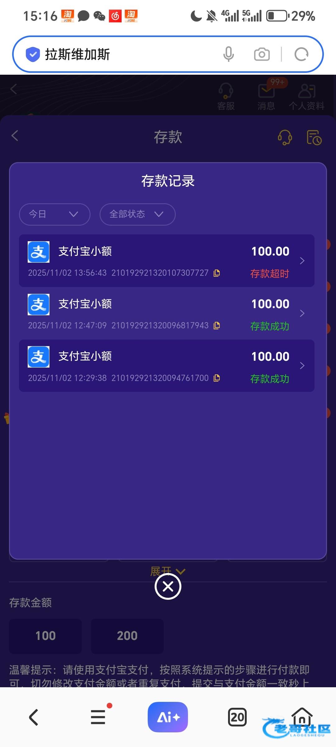 这个台一共输了1500加上今天100不到账,输1600,今天冲了3次100,前面两次100都到账了,都输了,充第三次100半个小时不到账问客服,一直查询下,又过了一个小时直接说没有收到,我没见过这么垃圾