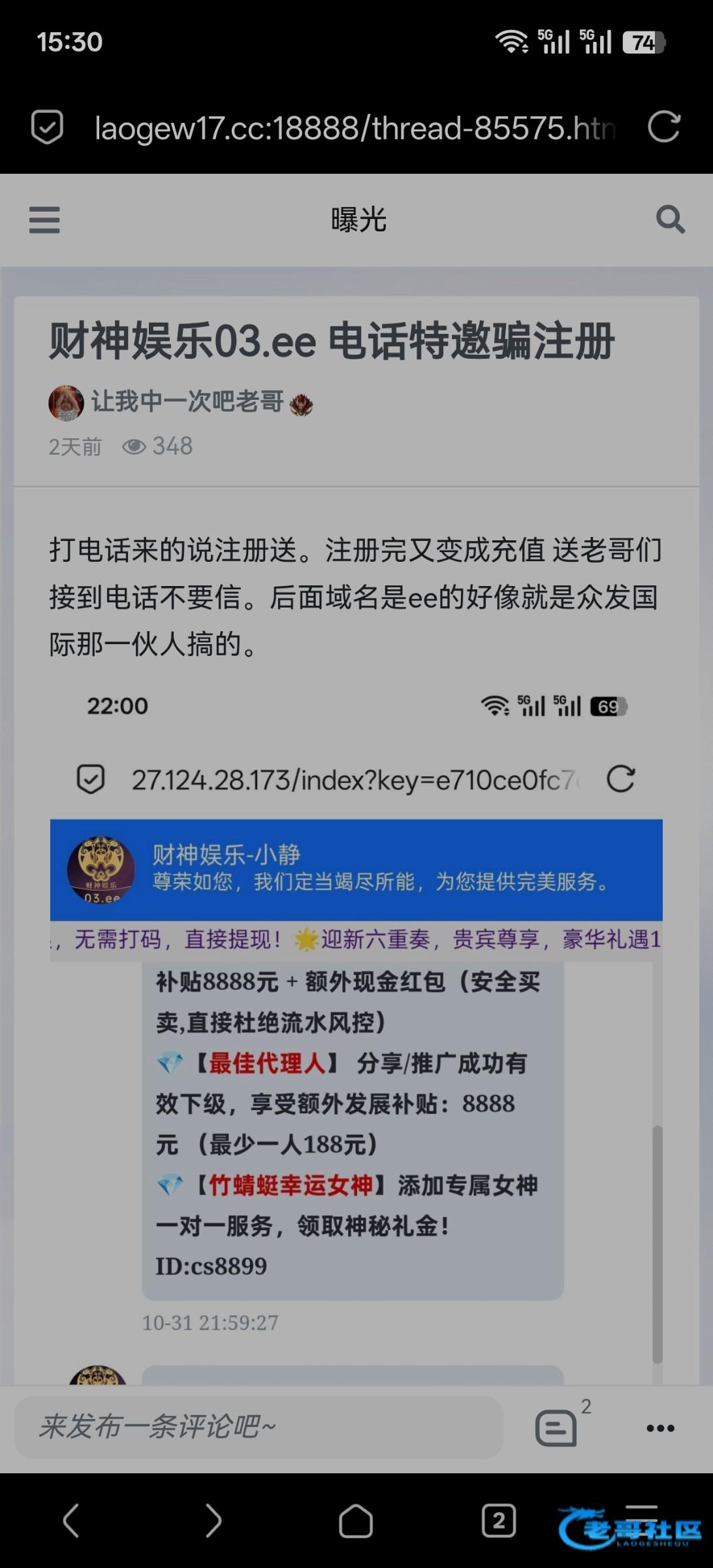 大家注意了 最近电话轰炸的网址是什么ee的基本上都是黑台 之前是澳彩平台天天轰炸 现在不轰炸了 又换了这种类型 平台网址ee结尾的 都是同一个套路 打开就是客服 忽悠你注册 等你注册了就是充值送 充值送就算了 平台还是黑台 基本上都是黑台 注意就行