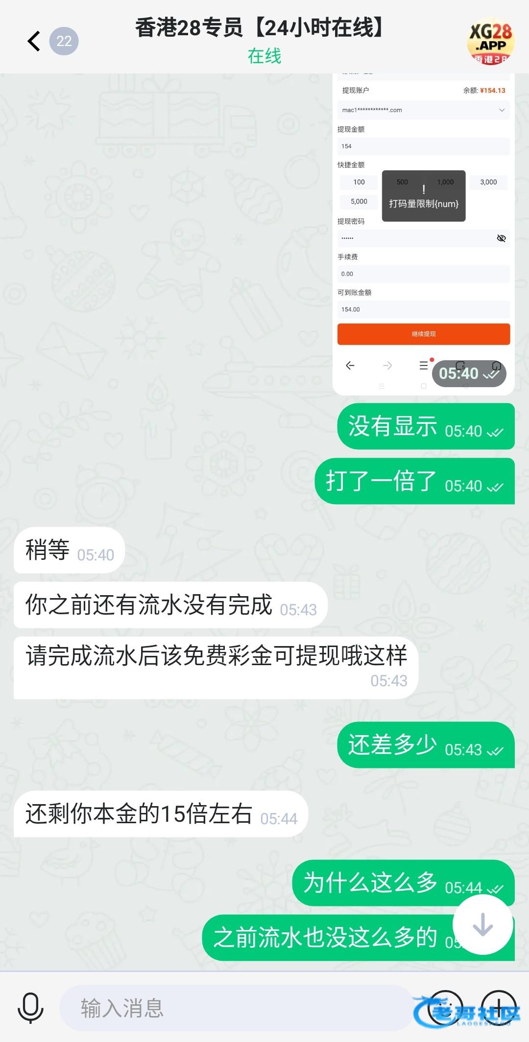 之前我在它平台充值过几次之前的流水都是达标要么死完了,然后昨天送88茶水按道理10倍流水可以下分,我打到154又叫我打154ⅹ15倍流水,无限流水黑台百度上类似战狼牛牛开元暴富都是他们一个公司的,心舟软件是他们公司研发的聊天APP杀大赔小玩加拿大的注意了