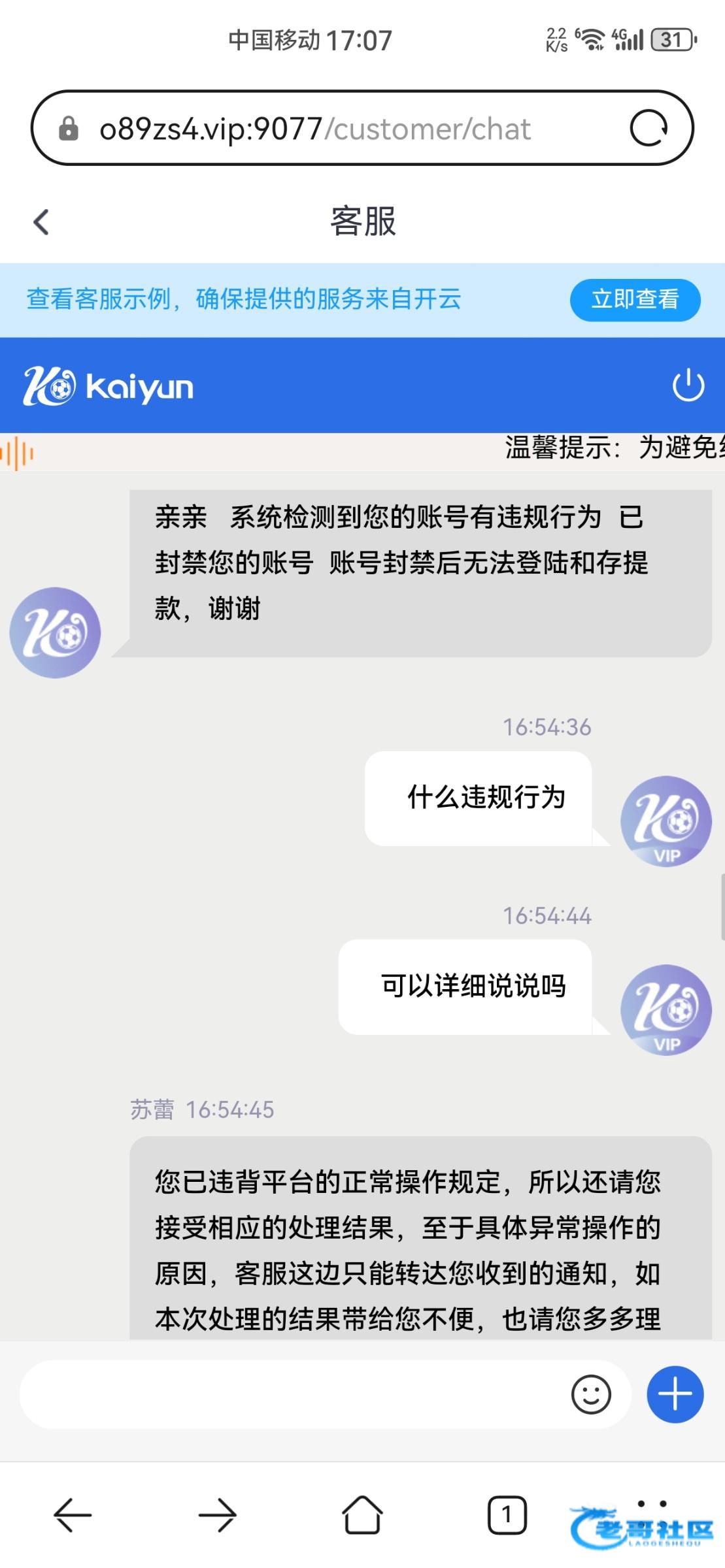 早就听说现在的开云经常封号,没想到这次轮到我身上了。2600多天的账号,以前亚博转移过来的。10月份还有存款游戏,今天领了个188彩金提款500就把账户封了。