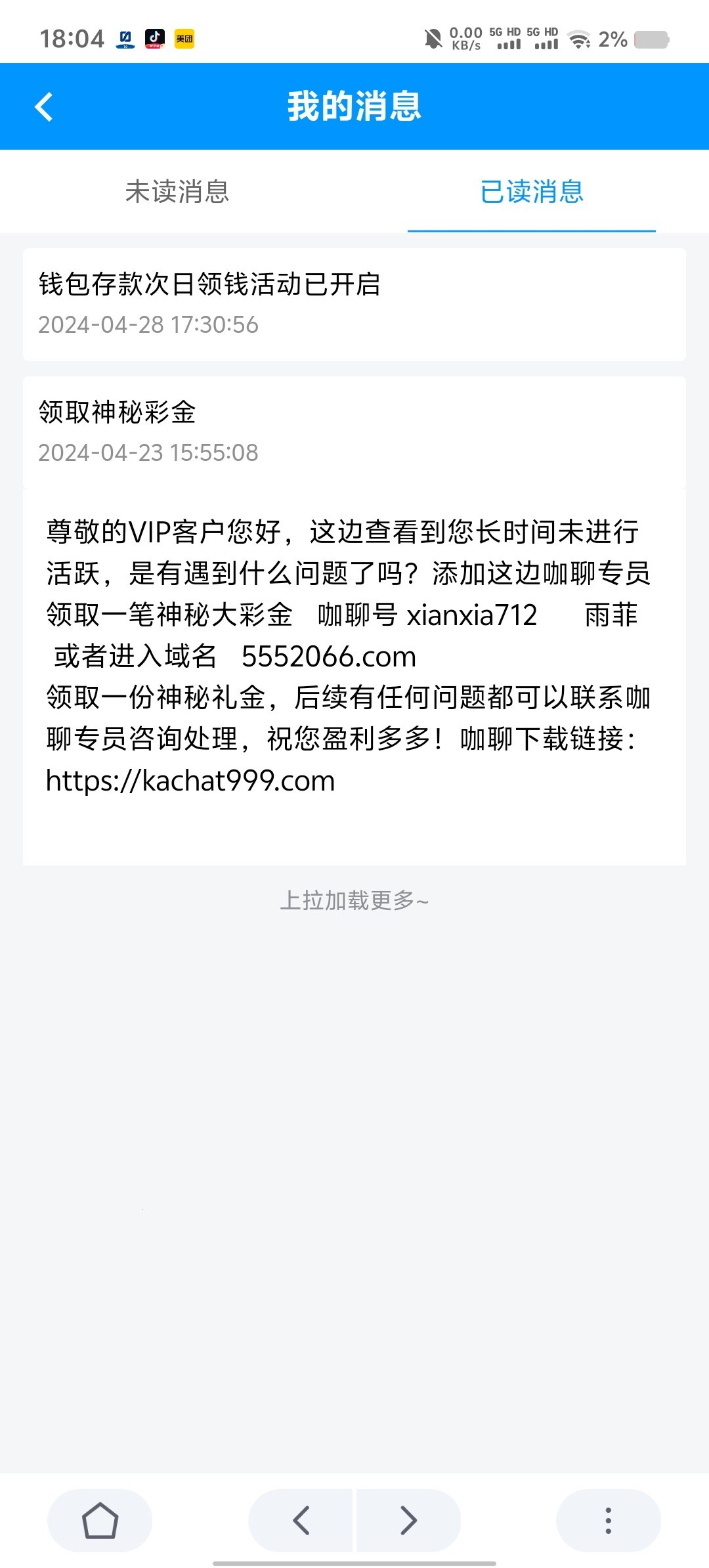 加上了先是会给你说一大堆充值活动,你就跟他先扯着然后再说先领取下神秘彩金,有站内信的去