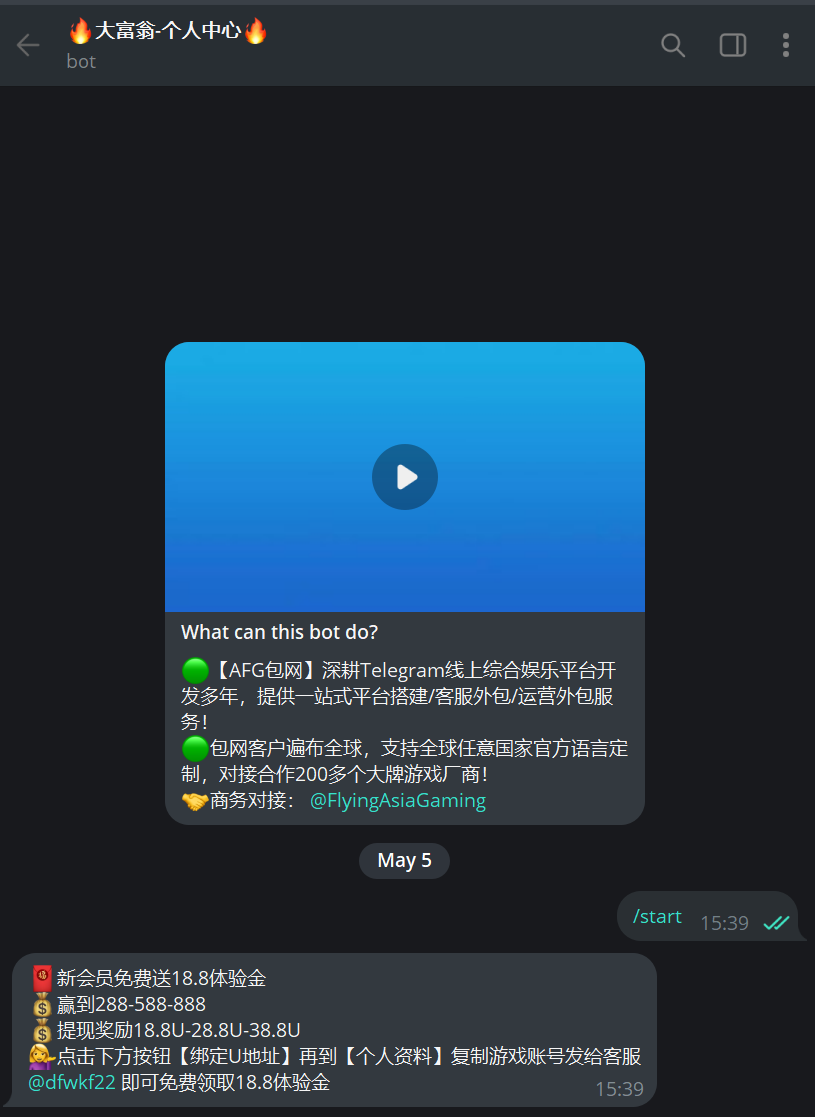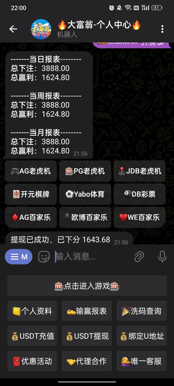 飞机机器人账号 @AFG_dfw_bot飞机客服账号 @dfwkf22机器人绑定U地址, 然后机器人点个人信息复制资料发给客服申请就行了。 电子打到对应分值下分