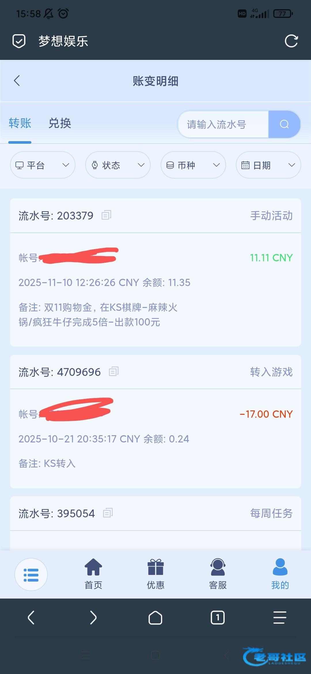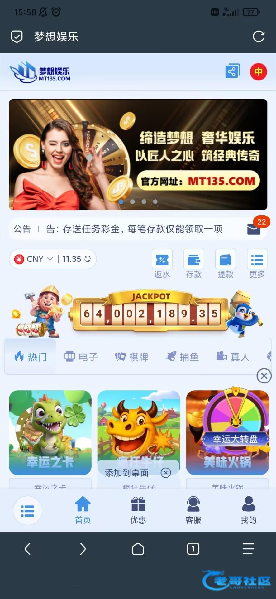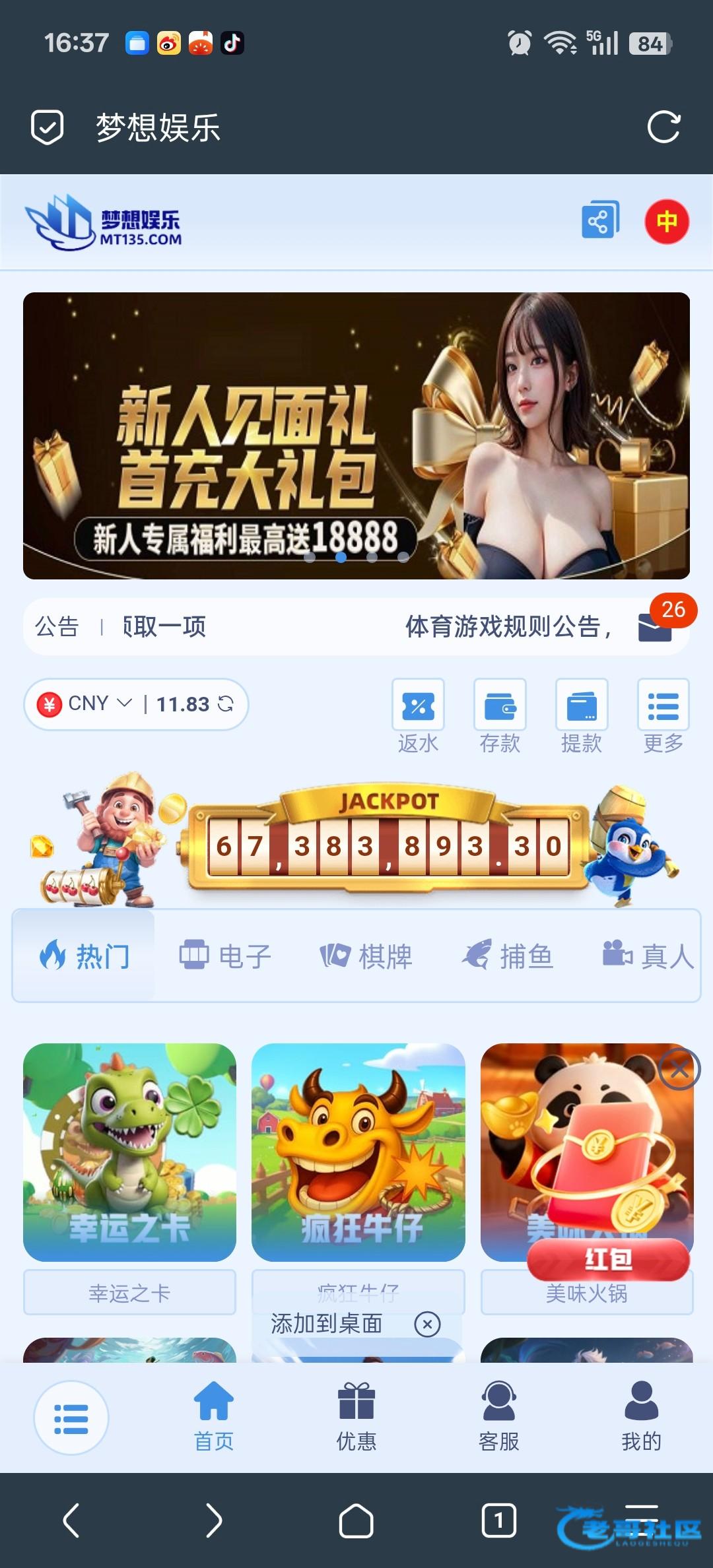 盛大双11购物节,公司针对近期活跃会员随机安排,添加11.11元购物彩金彩金需要在KS棋牌-麻辣火锅/疯狂牛仔完成5倍,即可提款100元