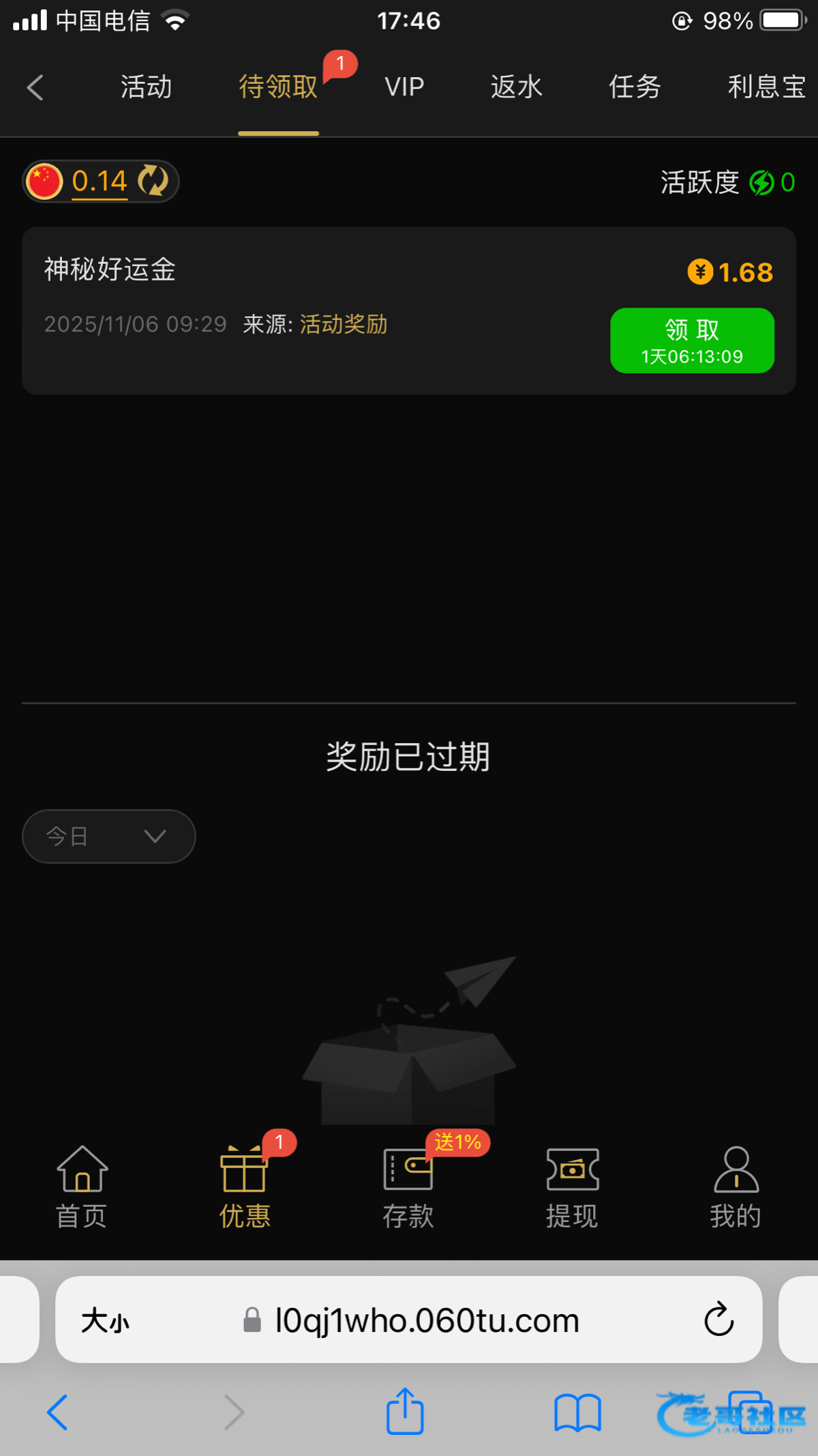 这种就别发了,上周不充值有鸡毛,这个台最几把扣门,神秘彩金就没超过两块,充值大几万,一点福利都没有