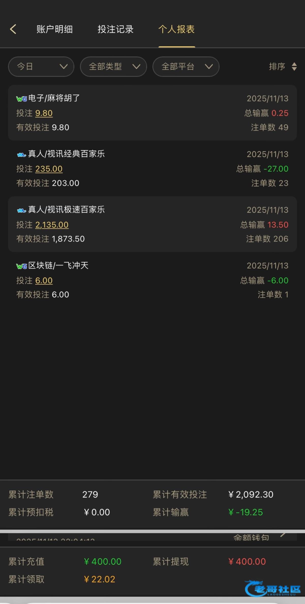 今日战绩:200局10元跟龙。恰好赢了100局。抽水输了20,但是优惠正好不回来。分币没亏没挣。大多数时间都是水下。wl真人龙是真的多。