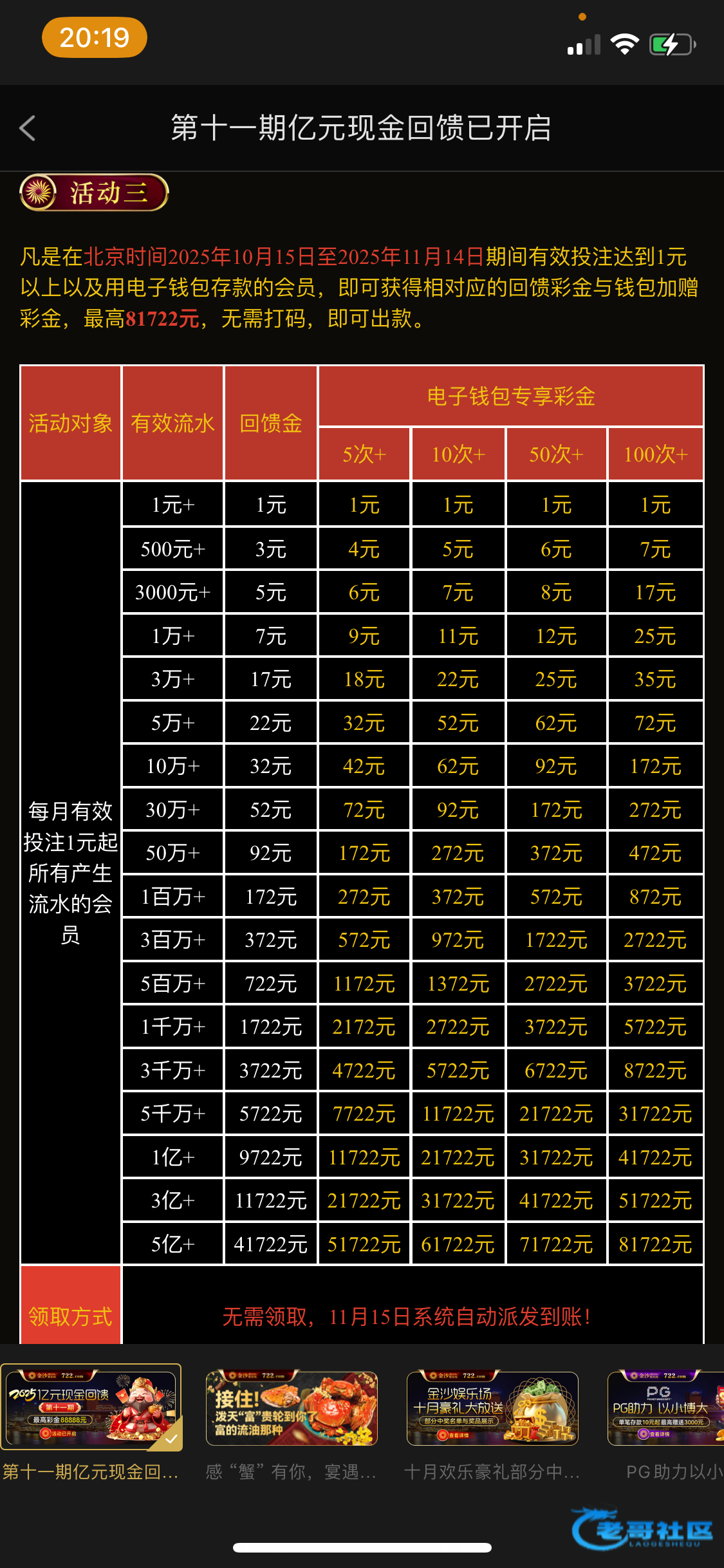 还有一小时了,没登录的老铁上去看看。能看到11期亿元回馈活动的账号基本都会有22。看不到这个活动的账户估计也不会有。