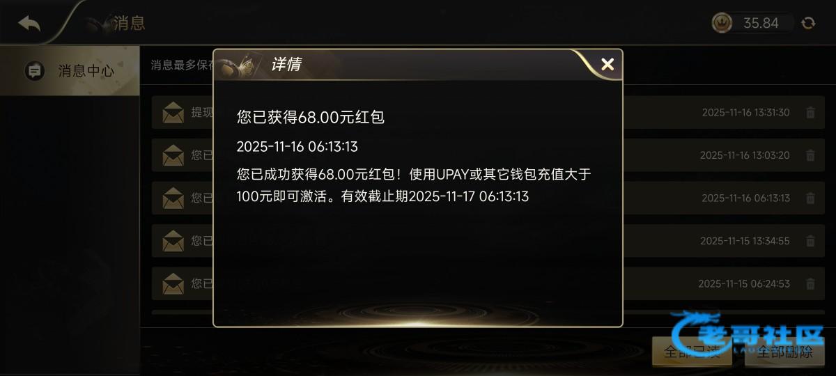 今天无意登录老哥网广告的大发908。发现有个68元红包。需要充值100才可以激活。就充值了100激活了。麻将十分钟三进免费,不过我是四毛党。提现400。秒到账。大家有号的去看看。每天免费四波红包雨。