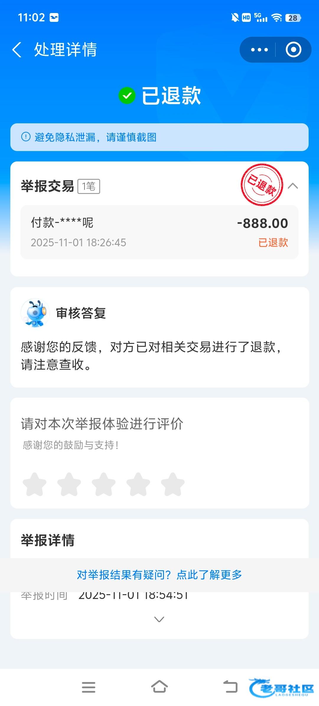 就你们这种的退费都退不明白,我都懒得搞了,后面的就别想了,想退费转账之后立马投诉,时间久了人家钱会转移,狗庄的收款码都是第三方的不是自己的(参考那些任务平台赏帮之类的高价收支付宝或支付宝实名那种)基本上都是狗子用来收款的,你们后面退隔个1个月更久的那种成功了都是人家号主自己受不了妥协的,如果真想退上一秒转下一秒就投诉,不能让狗庄把钱转走。