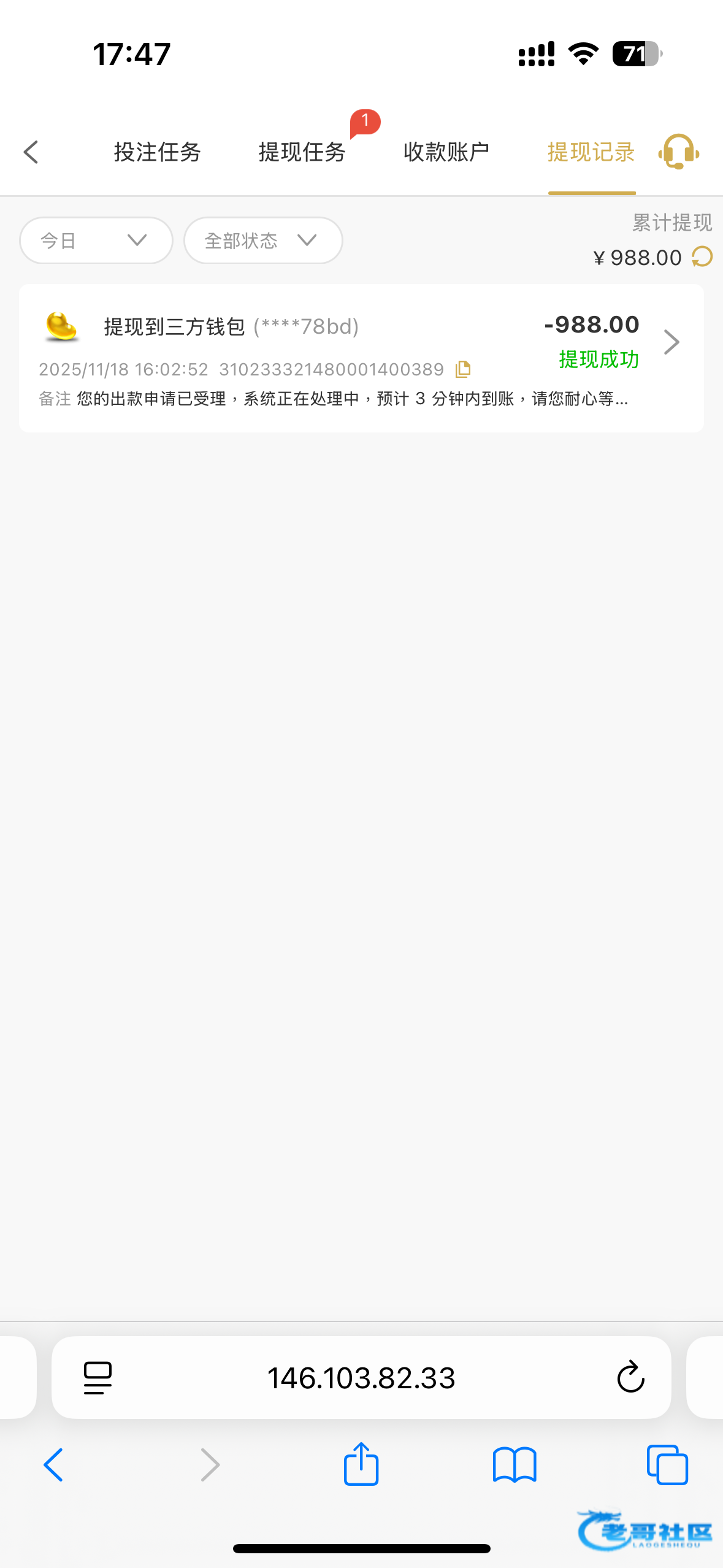 这种正常啊 我也遇到过 平台显示提现成功了 但是ok货币真的没有收到 一会就到了 应该是显示转账之类的 我之前ok挨过6万 平台显示到了 Ok没到 后面到了那个交易显示是转账 不是商家下发的