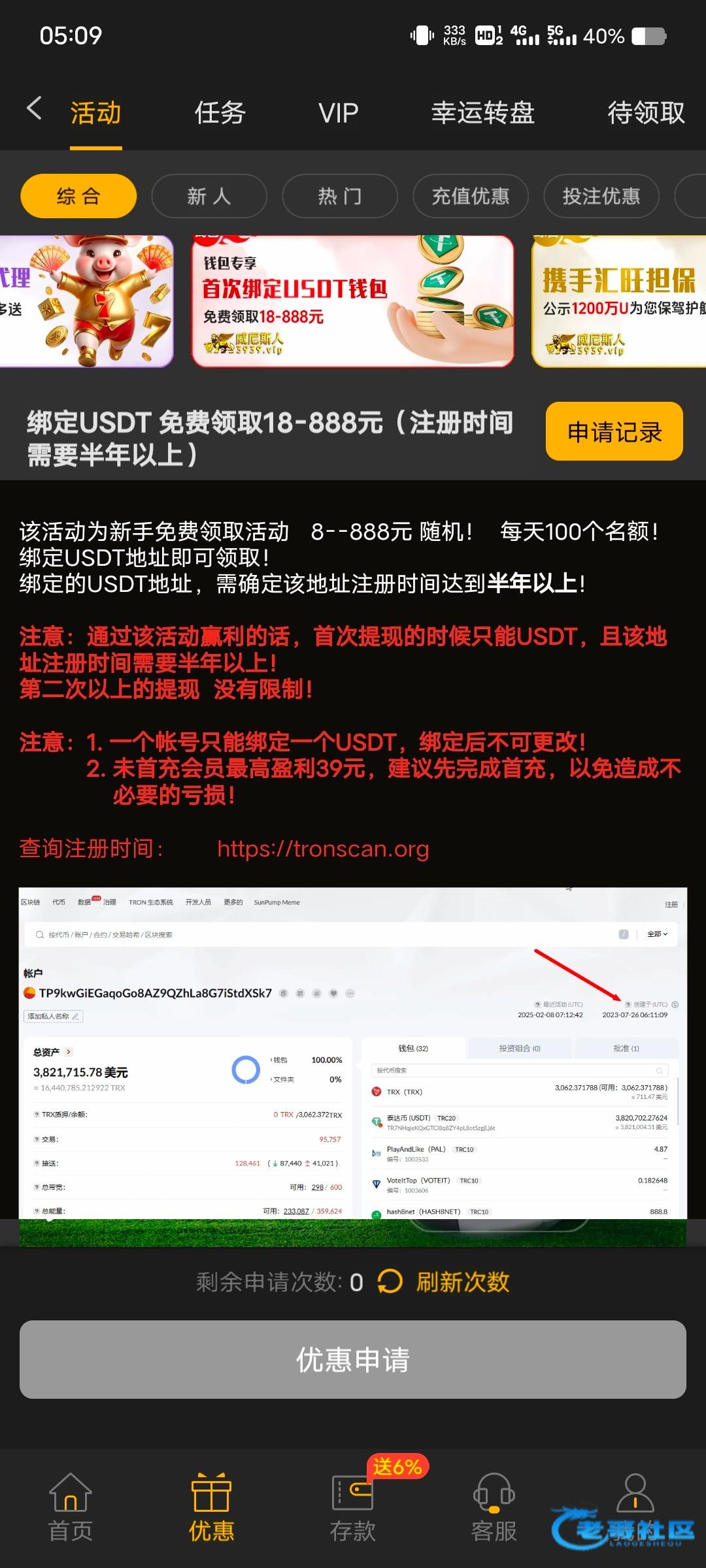 链接3939.com 绑定半年u地址送18 短信里面翻到的,下载 app 在活动里面申请,我几分钟就给了 没打出来,祝老哥们成功申请撸爆狗庄