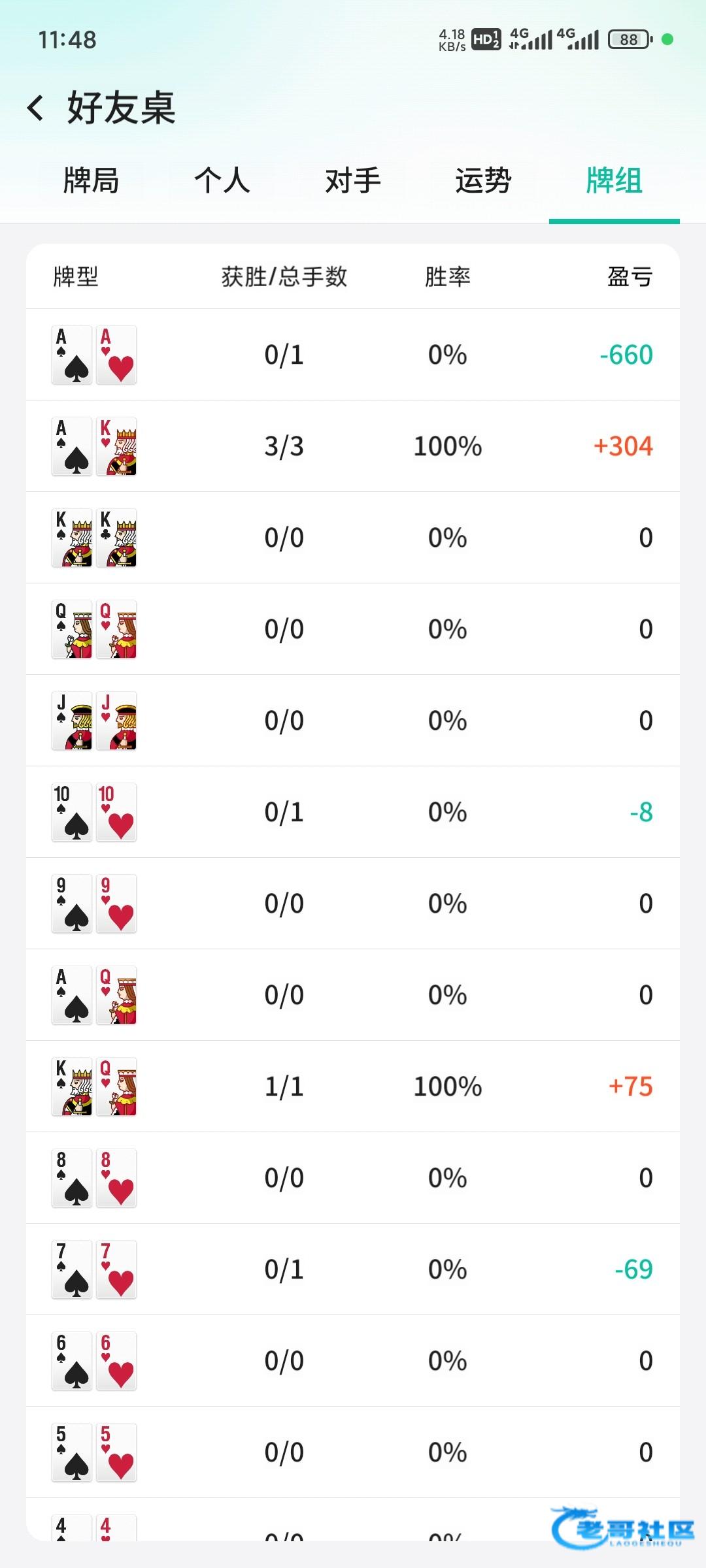 2/4的局2000分就打了26手,4000分两把牌就输没,各种冤家牌,手牌对a对k立马被河牌搞死